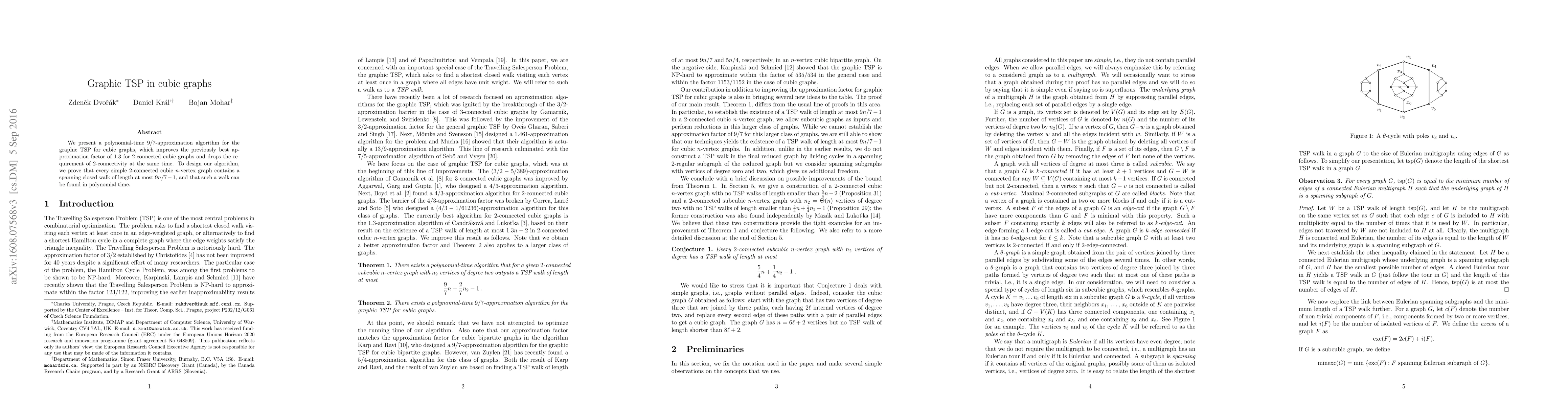 This paper introduces a polynomial-time 9/7-approximation algorithm for the graphic Traveling Salesman Problem (TSP) in cubic graphs, surpassing the previous best approximation factor of 1.3 for 2-connected cubic graphs. The algorithm does not require graph connectivity and leverages a proven result that every simple 2-connected cubic graph has a spanning closed walk of length at most 9n/7-1.