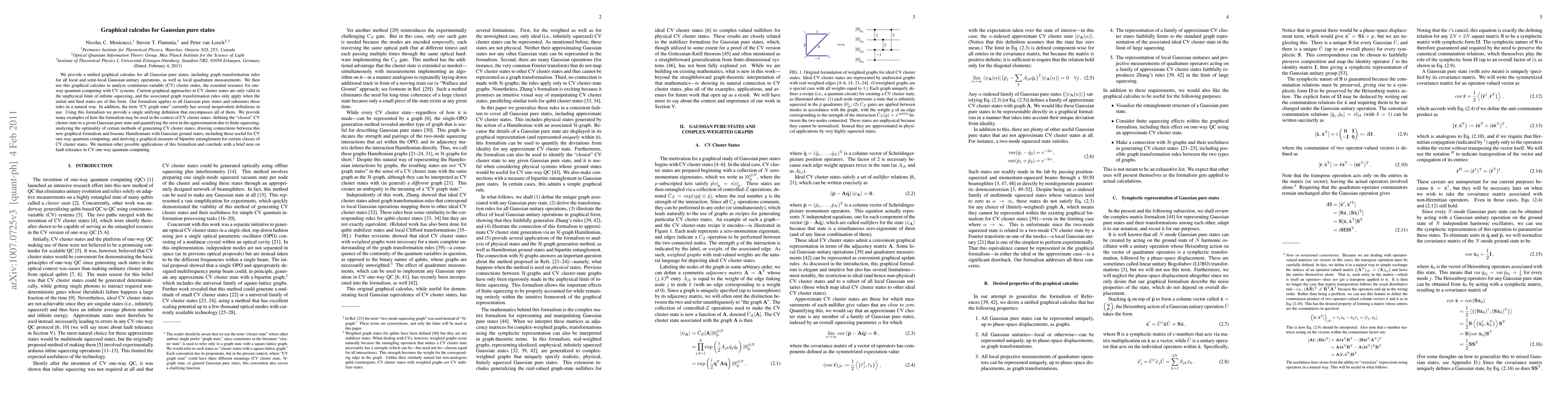 This paper introduces a graphical calculus for Gaussian pure states, offering transformation rules for local and semi-local Gaussian unitary operations and quadrature measurements. It unifies existing definitions of continuous-variable cluster states and provides a comprehensive approach applicable to all Gaussian pure states, enabling analysis of CV cluster states' optimality and bipartite entanglement.