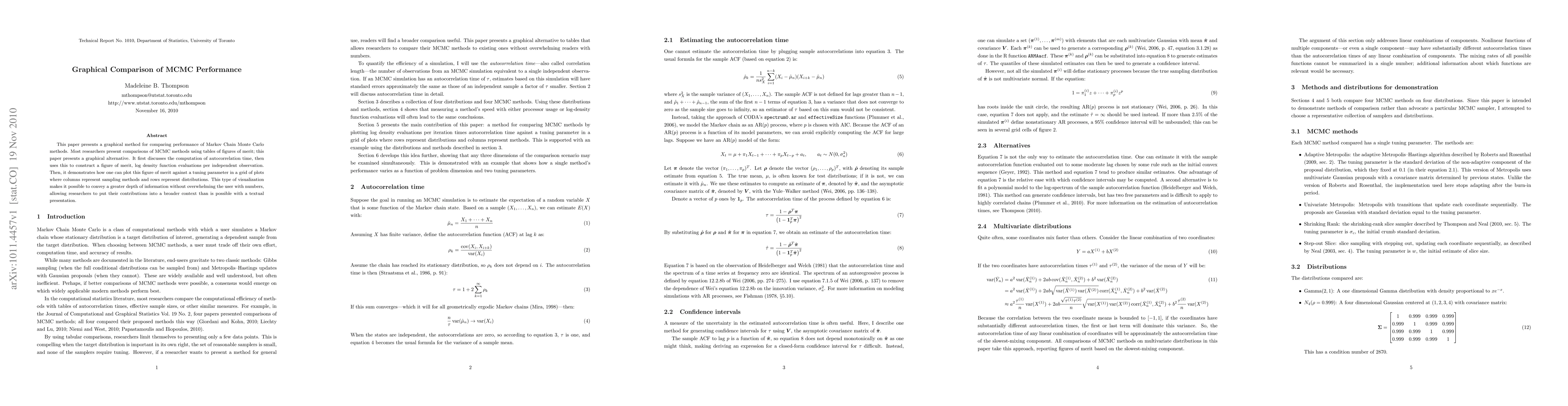 This paper proposes a graphical method to compare Markov Chain Monte Carlo (MCMC) methods' performance, contrasting traditional table-based presentations. It introduces a figure of merit based on autocorrelation time and log density function evaluations per independent observation. The method involves plotting this figure against tuning parameters in a grid, with columns for sampling methods and rows for distributions, facilitating easier interpretation and contextual understanding of research contributions.