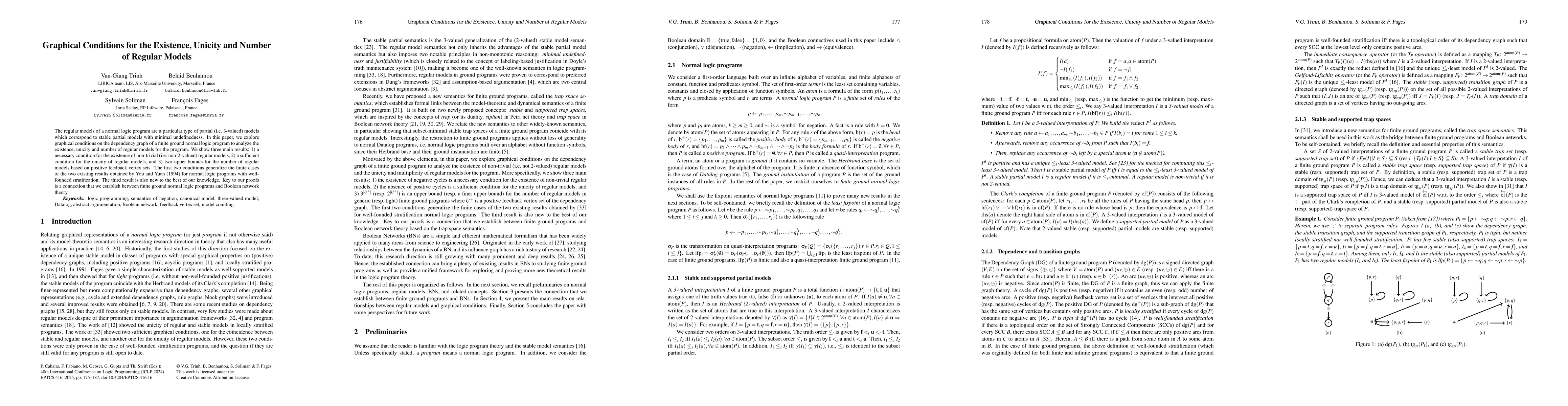 This paper examines graphical conditions on the dependency graph of a finite ground normal logic program to determine the existence, unicity, and number of its regular models. It presents a necessary condition for non-trivial regular models, a sufficient condition for their unicity, and new upper bounds for their number based on positive feedback vertex sets.
