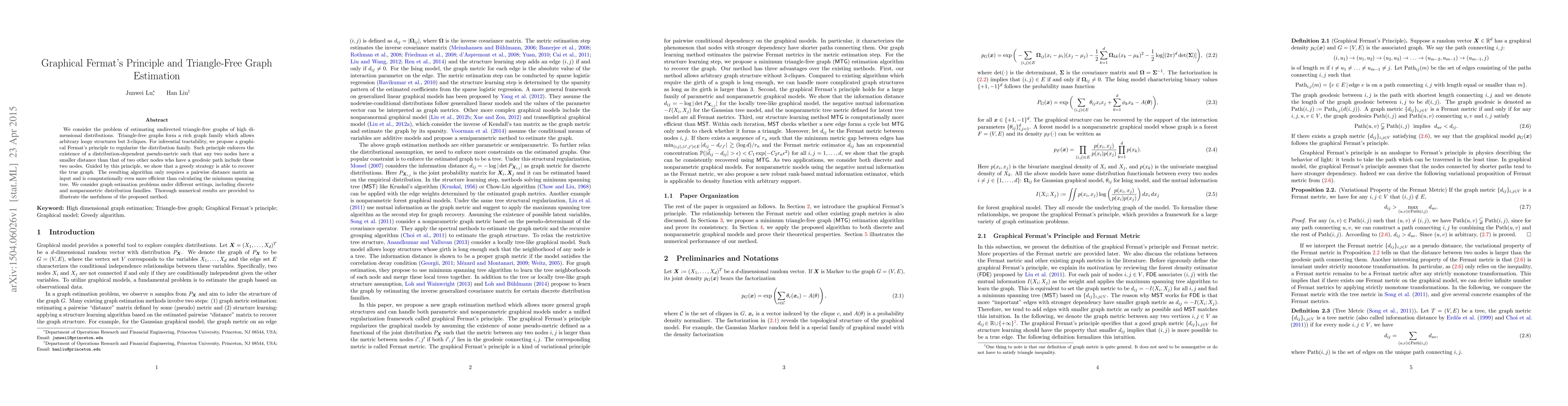 We consider the problem of estimating undirected triangle-free graphs of high dimensional distributions. Triangle-free graphs form a rich graph family which allows arbitrary loopy structures but 3-cliques. For inferential tractability, we propose a graphical Fermat's principle to regularize the distribution family. Such principle enforces the existence of a distribution-dependent pseudo-metric such that any two nodes have a smaller distance than that of two other nodes who have a geodesic path include these two nodes. Guided by this principle, we show that a greedy strategy is able to recover the true graph. The resulting algorithm only requires a pairwise distance matrix as input and is computationally even more efficient than calculating the minimum spanning tree. We consider graph estimation problems under different settings, including discrete and nonparametric distribution families. Thorough numerical results are provided to illustrate the usefulness of the proposed method.