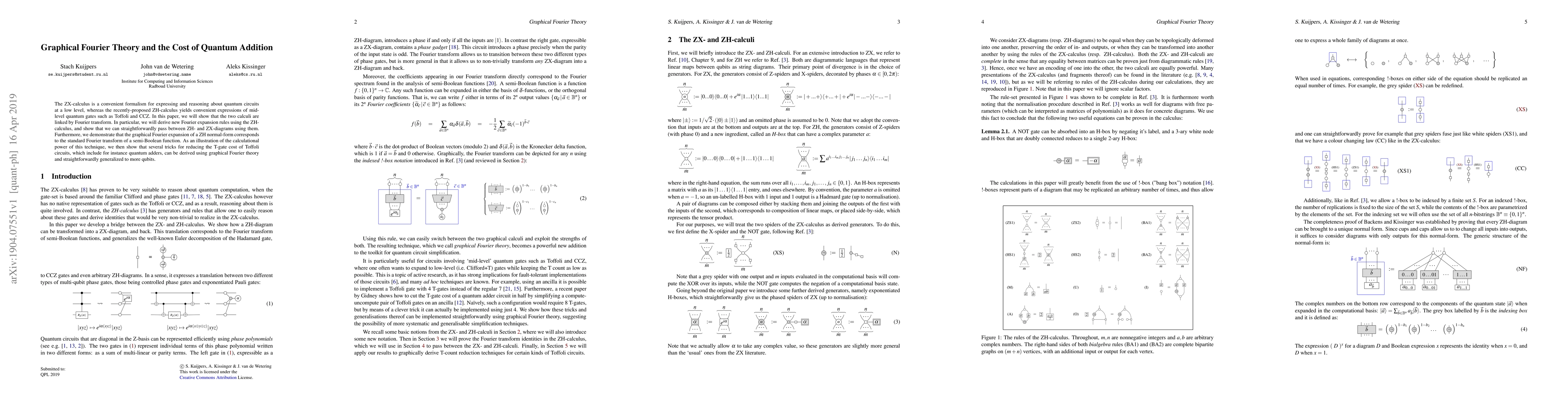This paper establishes a connection between the ZX-calculus and ZH-calculus for quantum circuits, deriving new Fourier expansion rules using the ZH-calculus. It demonstrates how graphical Fourier theory can reduce the T-gate cost of Toffoli circuits, illustrating its practical application in quantum computation.