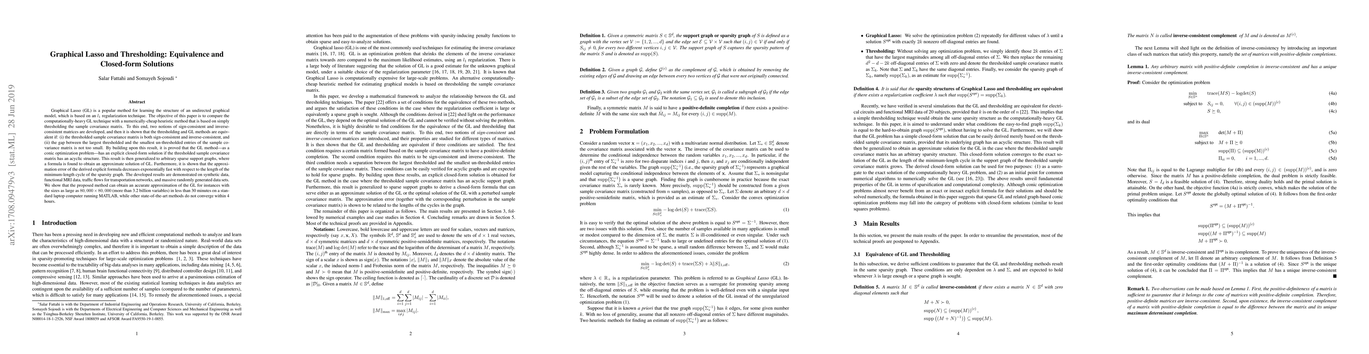 Graphical Lasso (GL) is a popular method for learning the structure of an undirected graphical model, which is based on an $l_1$ regularization technique. The objective of this paper is to compare the computationally-heavy GL technique with a numerically-cheap heuristic method that is based on simply thresholding the sample covariance matrix. To this end, two notions of sign-consistent and inverse-consistent matrices are developed, and then it is shown that the thresholding and GL methods are equivalent if: (i) the thresholded sample covariance matrix is both sign-consistent and inverse-consistent, and (ii) the gap between the largest thresholded and the smallest un-thresholded entries of the sample covariance matrix is not too small. By building upon this result, it is proved that the GL method---as a conic optimization problem---has an explicit closed-form solution if the thresholded sample covariance matrix has an acyclic structure. This result is then generalized to arbitrary sparse support graphs, where a formula is found to obtain an approximate solution of GL. Furthermore, it is shown that the approximation error of the derived explicit formula decreases exponentially fast with respect to the length of the minimum-length cycle of the sparsity graph. The developed results are demonstrated on synthetic data, functional MRI data, traffic flows for transportation networks, and massive randomly generated data sets. We show that the proposed method can obtain an accurate approximation of the GL for instances with the sizes as large as $80,000\times 80,000$ (more than 3.2 billion variables) in less than 30 minutes on a standard laptop computer running MATLAB, while other state-of-the-art methods do not converge within 4 hours.