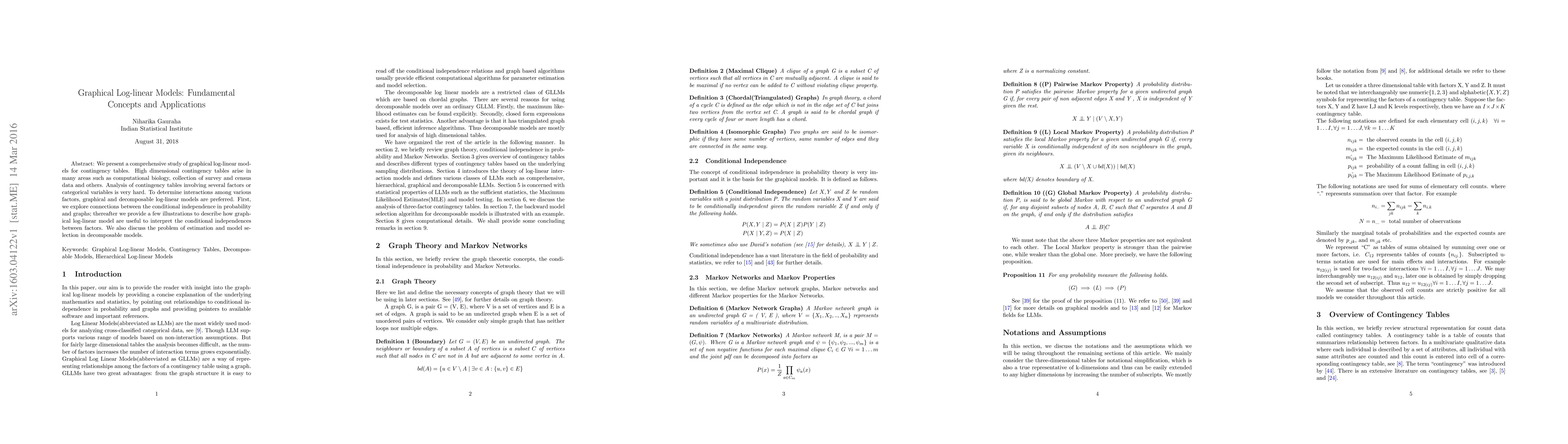 We present a comprehensive study of graphical log-linear models for contingency tables. High dimensional contingency tables arise in many areas such as computational biology, collection of survey and census data and others. Analysis of contingency tables involving several factors or categorical variables is very hard. To determine interactions among various factors, graphical and decomposable log-linear models are preferred. First, we explore connections between the conditional independence in probability and graphs; thereafter we provide a few illustrations to describe how graphical log-linear model are useful to interpret the conditional independences between factors. We also discuss the problem of estimation and model selection in decomposable models.