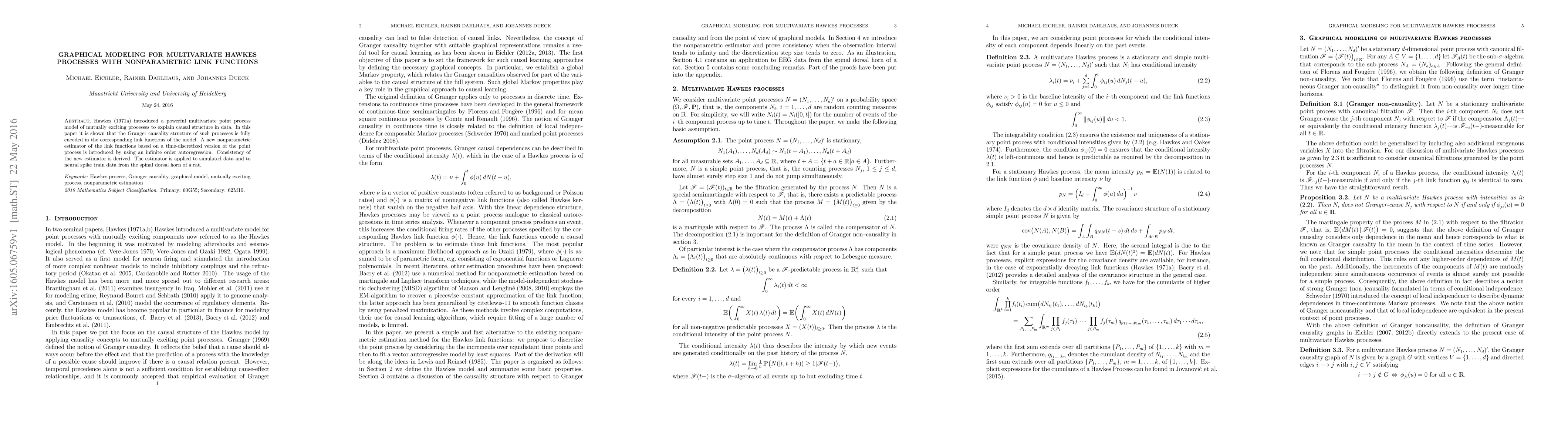 Hawkes (1971) introduced a powerful multivariate point process model of mutually exciting processes to explain causal structure in data. In this paper it is shown that the Granger causality structure of such processes is fully encoded in the corresponding link functions of the model. A new nonparametric estimator of the link functions based on a time-discretized version of the point process is introduced by using an infinite order autoregression. Consistency of the new estimator is derived. The estimator is applied to simulated data and to neural spike train data from the spinal dorsal horn of a rat.