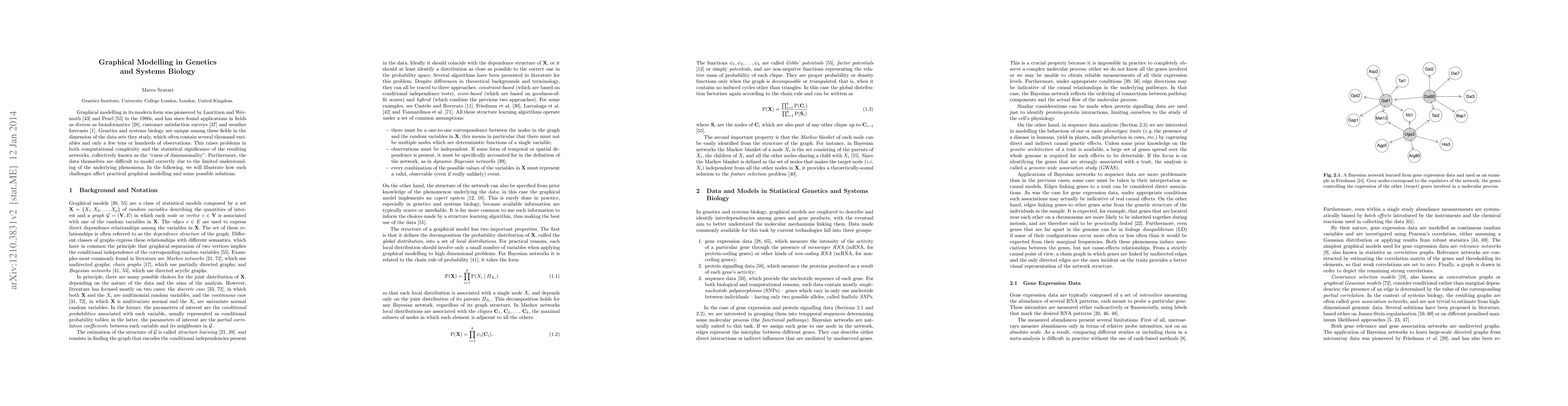 Graphical modelling has a long history in statistics as a tool for the analysis of multivariate data, starting from Wright's path analysis and Gibbs' applications to statistical physics at the beginning of the last century. In its modern form, it was pioneered by Lauritzen and Wermuth and Pearl in the 1980s, and has since found applications in fields as diverse as bioinformatics, customer satisfaction surveys and weather forecasts. Genetics and systems biology are unique among these fields in the dimension of the data sets they study, which often contain several hundreds of variables and only a few tens or hundreds of observations. This raises problems in both computational complexity and the statistical significance of the resulting networks, collectively known as the "curse of dimensionality". Furthermore, the data themselves are difficult to model correctly due to the limited understanding of the underlying mechanisms. In the following, we will illustrate how such challenges affect practical graphical modelling and some possible solutions.