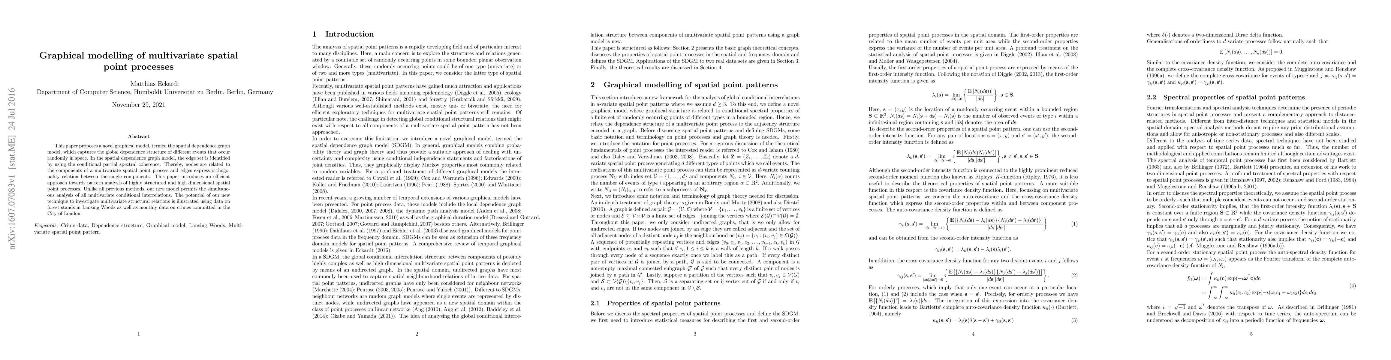 This paper proposes a novel graphical model, termed the spatial dependence graph model, which captures the global dependence structure of different events that occur randomly in space. In the spatial dependence graph model, the edge set is identified by using the conditional partial spectral coherence. Thereby, nodes are related to the components of a multivariate spatial point process and edges express orthogonality relation between the single components. This paper introduces an efficient approach towards pattern analysis of highly structured and high dimensional spatial point processes. Unlike all previous methods, our new model permits the simultaneous analysis of all multivariate conditional interrelations. The potential of our new technique to investigate multivariate structural relations is illustrated using data on forest stands in Lansing Woods as well as monthly data on crimes committed in the City of London.