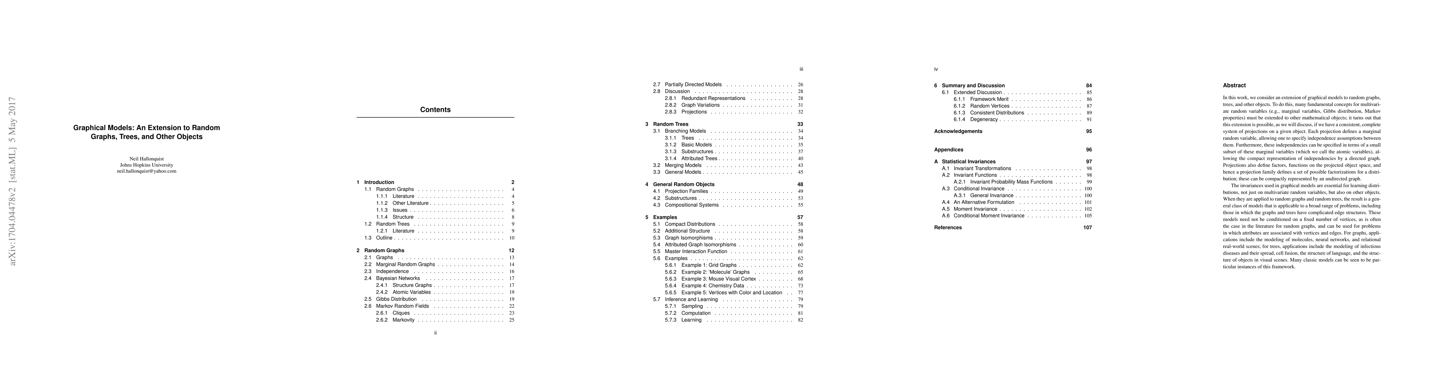 In this work, we consider an extension of graphical models to random graphs, trees, and other objects. To do this, many fundamental concepts for multivariate random variables (e.g., marginal variables, Gibbs distribution, Markov properties) must be extended to other mathematical objects; it turns out that this extension is possible, as we will discuss, if we have a consistent, complete system of projections on a given object. Each projection defines a marginal random variable, allowing one to specify independence assumptions between them. Furthermore, these independencies can be specified in terms of a small subset of these marginal variables (which we call the atomic variables), allowing the compact representation of independencies by a directed graph. Projections also define factors, functions on the projected object space, and hence a projection family defines a set of possible factorizations for a distribution; these can be compactly represented by an undirected graph. The invariances used in graphical models are essential for learning distributions, not just on multivariate random variables, but also on other objects. When they are applied to random graphs and random trees, the result is a general class of models that is applicable to a broad range of problems, including those in which the graphs and trees have complicated edge structures. These models need not be conditioned on a fixed number of vertices, as is often the case in the literature for random graphs, and can be used for problems in which attributes are associated with vertices and edges. For graphs, applications include the modeling of molecules, neural networks, and relational real-world scenes; for trees, applications include the modeling of infectious diseases, cell fusion, the structure of language, and the structure of objects in visual scenes. Many classic models are particular instances of this framework.