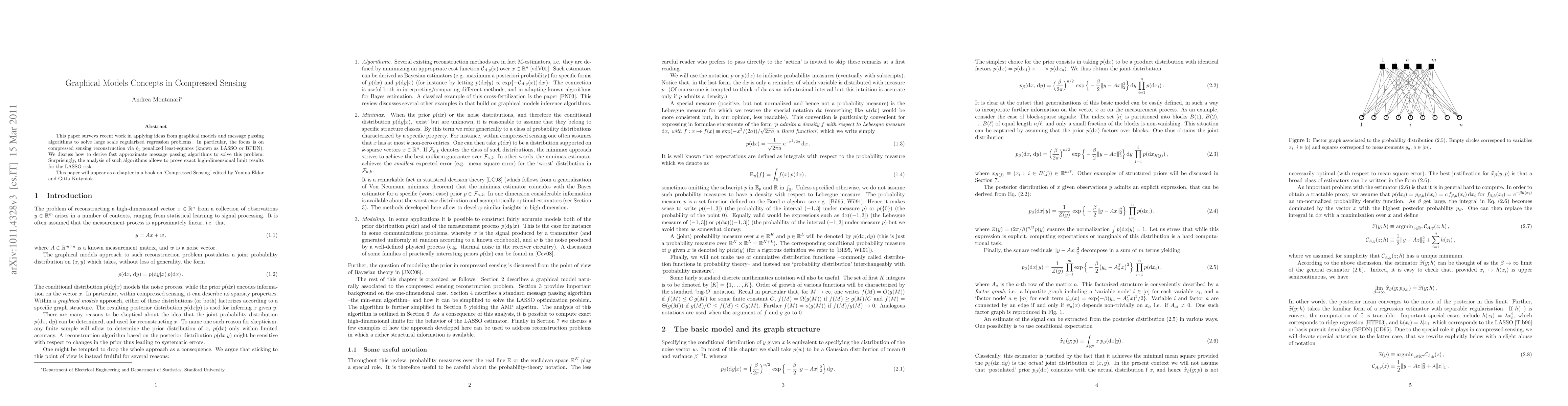 This paper surveys recent work in applying ideas from graphical models and message passing algorithms to solve large scale regularized regression problems. In particular, the focus is on compressed sensing reconstruction via ell_1 penalized least-squares (known as LASSO or BPDN). We discuss how to derive fast approximate message passing algorithms to solve this problem. Surprisingly, the analysis of such algorithms allows to prove exact high-dimensional limit results for the LASSO risk. This paper will appear as a chapter in a book on `Compressed Sensing' edited by Yonina Eldar and Gitta Kutyniok.