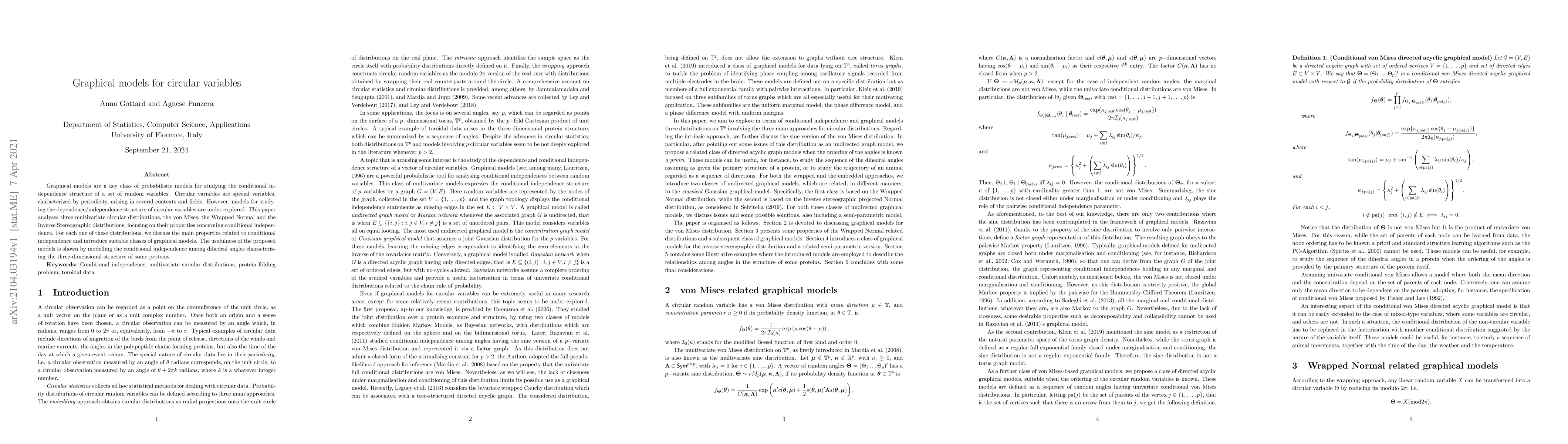 This paper explores graphical models for circular variables, analyzing three multivariate circular distributions—von Mises, Wrapped Normal, and Inverse Stereographic—to understand their conditional independence properties and introduces suitable graphical models for each. The models are demonstrated through applications to dihedral angles in protein structures.