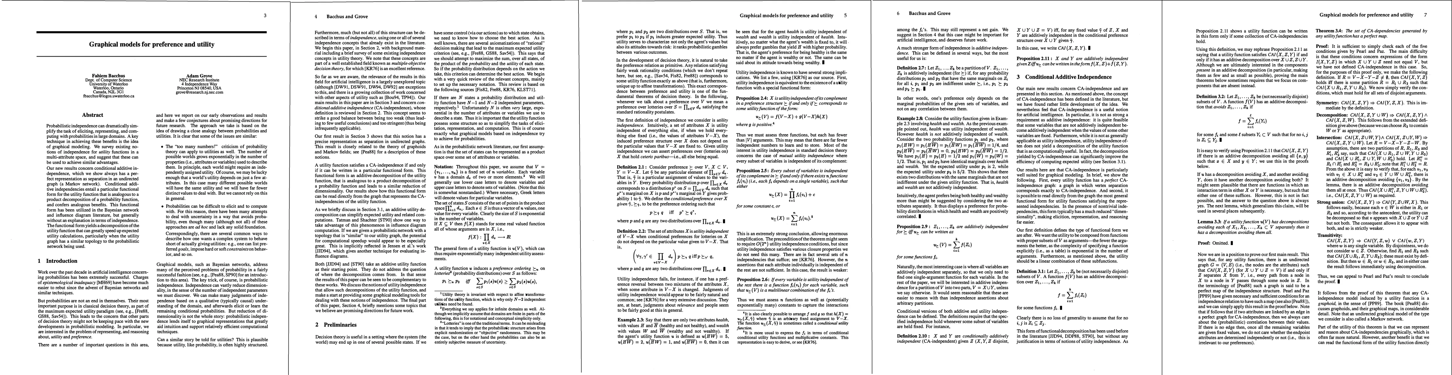 Probabilistic independence can dramatically simplify the task of eliciting, representing, and computing with probabilities in large domains. A key technique in achieving these benefits is the idea of graphical modeling. We survey existing notions of independence for utility functions in a multi-attribute space, and suggest that these can be used to achieve similar advantages. Our new results concern conditional additive independence, which we show always has a perfect representation as separation in an undirected graph (a Markov network). Conditional additive independencies entail a particular functional for the utility function that is analogous to a product decomposition of a probability function, and confers analogous benefits. This functional form has been utilized in the Bayesian network and influence diagram literature, but generally without an explanation in terms of independence. The functional form yields a decomposition of the utility function that can greatly speed up expected utility calculations, particularly when the utility graph has a similar topology to the probabilistic network being used.