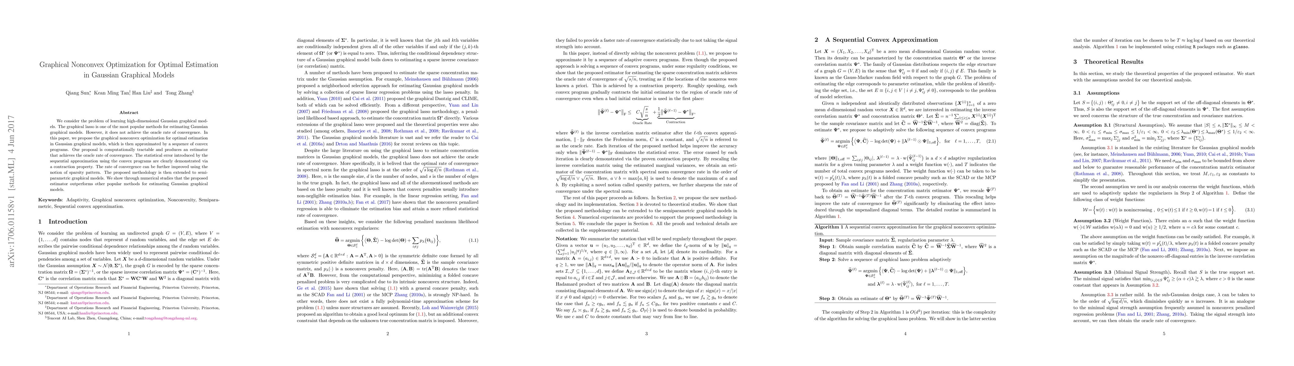 We consider the problem of learning high-dimensional Gaussian graphical models. The graphical lasso is one of the most popular methods for estimating Gaussian graphical models. However, it does not achieve the oracle rate of convergence. In this paper, we propose the graphical nonconvex optimization for optimal estimation in Gaussian graphical models, which is then approximated by a sequence of convex programs. Our proposal is computationally tractable and produces an estimator that achieves the oracle rate of convergence. The statistical error introduced by the sequential approximation using the convex programs are clearly demonstrated via a contraction property. The rate of convergence can be further improved using the notion of sparsity pattern. The proposed methodology is then extended to semiparametric graphical models. We show through numerical studies that the proposed estimator outperforms other popular methods for estimating Gaussian graphical models.