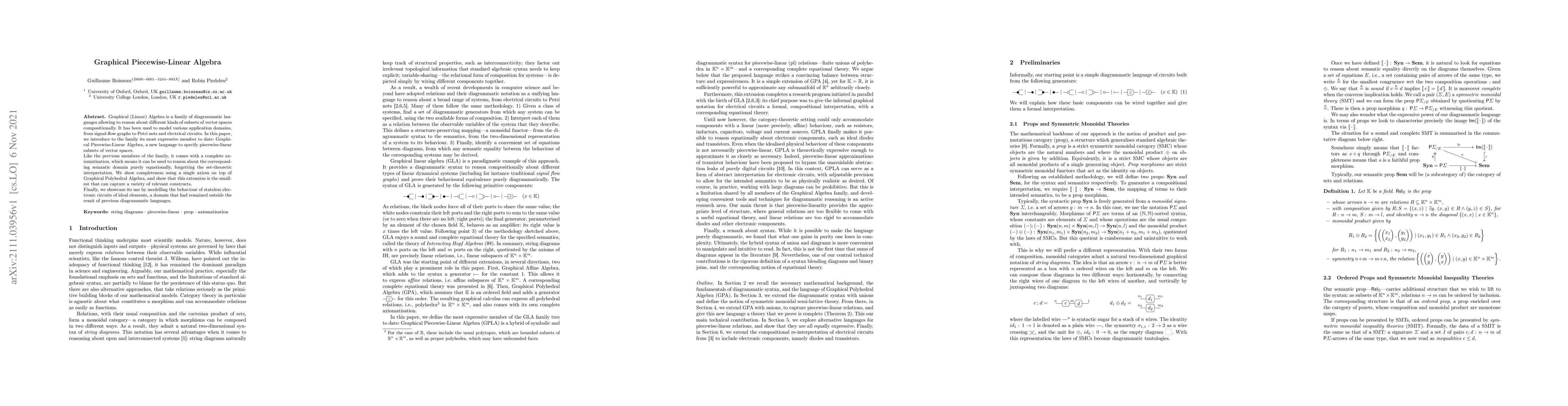 This paper introduces Graphical Piecewise-Linear Algebra, a new diagrammatic language for specifying piecewise-linear subsets of vector spaces. It provides a complete axiomatization, allowing purely equational reasoning, and demonstrates its application in modeling stateless electronic circuits.
