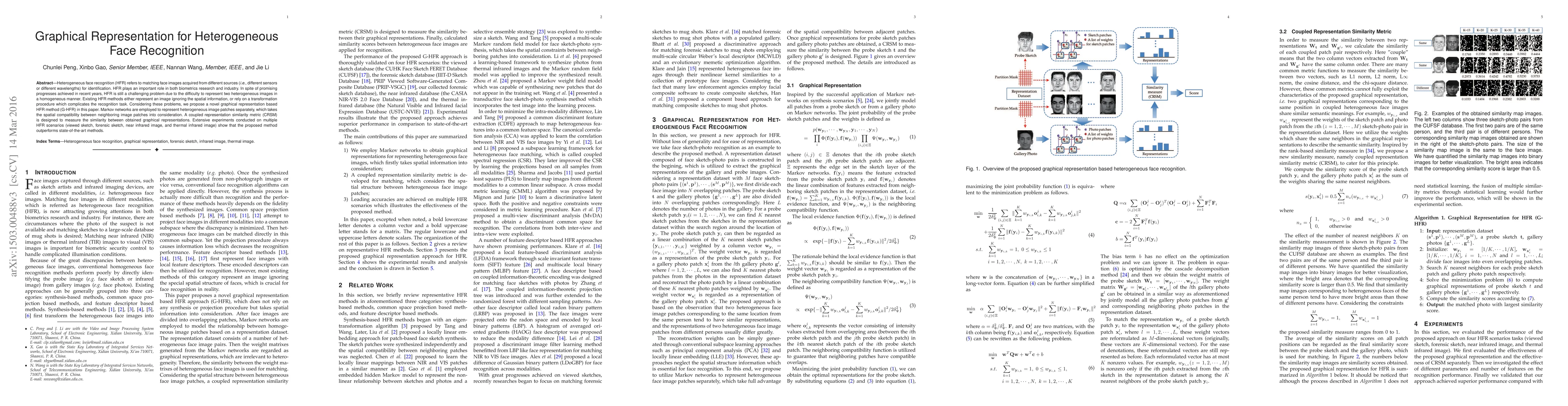 The main technical contribution of this work is the development of a novel graphical representation for heterogeneous face recognition (G-HFR) that employs Markov networks and a coupled representation similarity metric (CRSM) to effectively capture spatial compatibility between image patches.