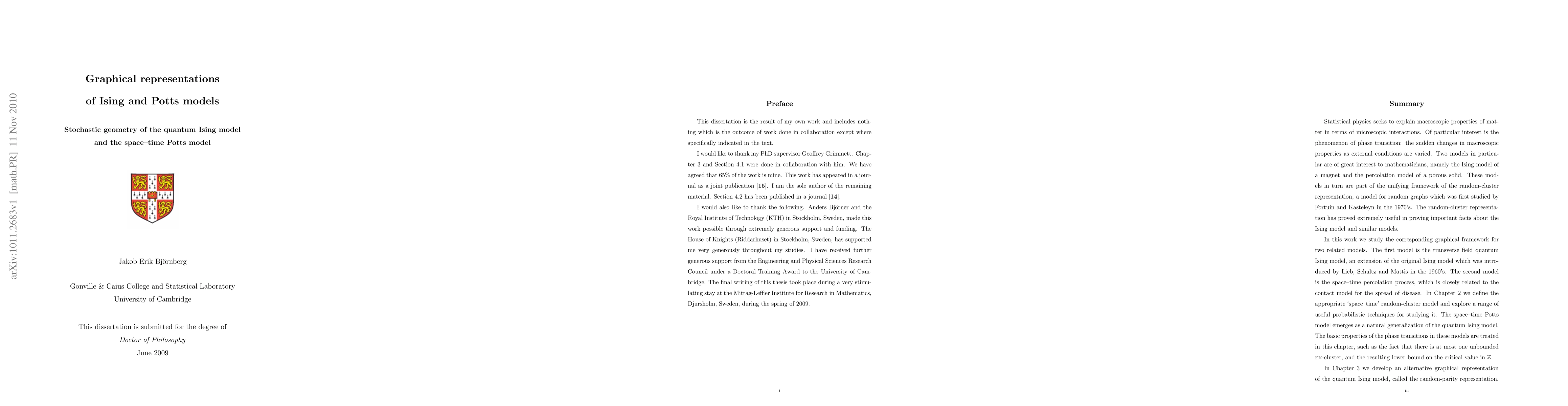 This paper investigates graphical representations of the transverse field quantum Ising model and the space-time Potts model, employing probabilistic techniques to study their phase transitions. It introduces a novel random-parity representation for the quantum Ising model, proving the sharpness of its phase transition and establishing critical exponent bounds.