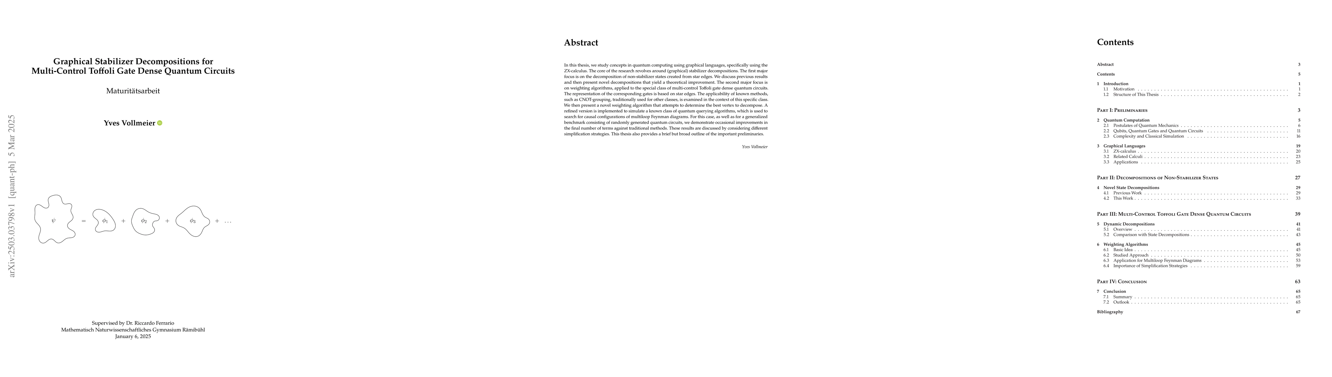 This thesis explores quantum computing through the ZX-calculus, focusing on graphical stabilizer decompositions for multi-control Toffoli gate dense quantum circuits. It introduces novel decompositions for non-stabilizer states and presents a refined weighting algorithm that improves the efficiency of these circuits, demonstrating occasional improvements over traditional methods.
