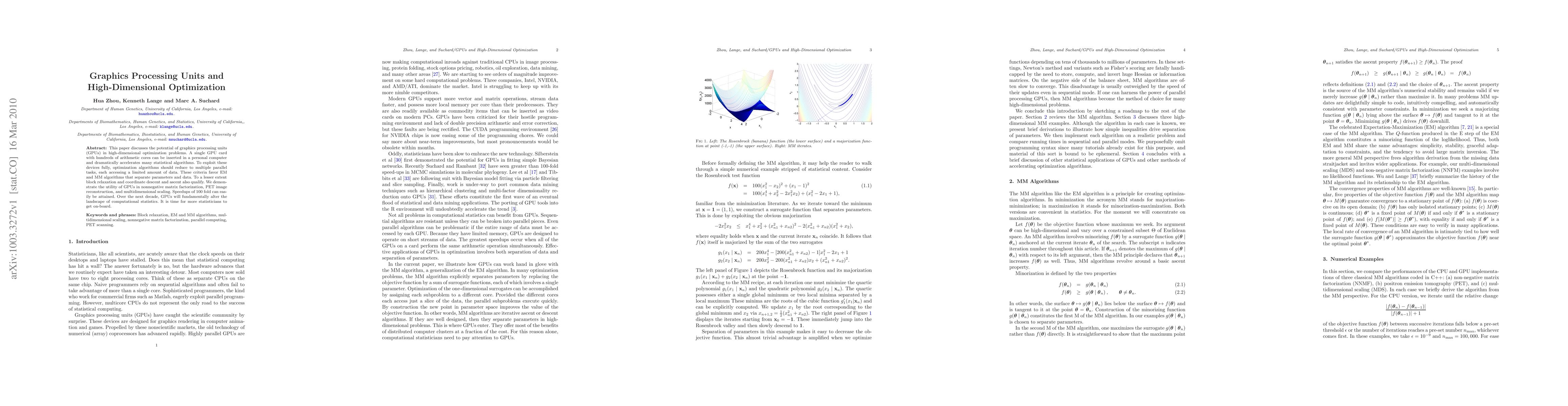 This paper explores how GPUs can significantly accelerate high-dimensional optimization tasks, particularly through parallelizable algorithms like EM and MM. Demonstrated applications include nonnegative matrix factorization and PET image reconstruction, showing potential speedups of up to 100 times.