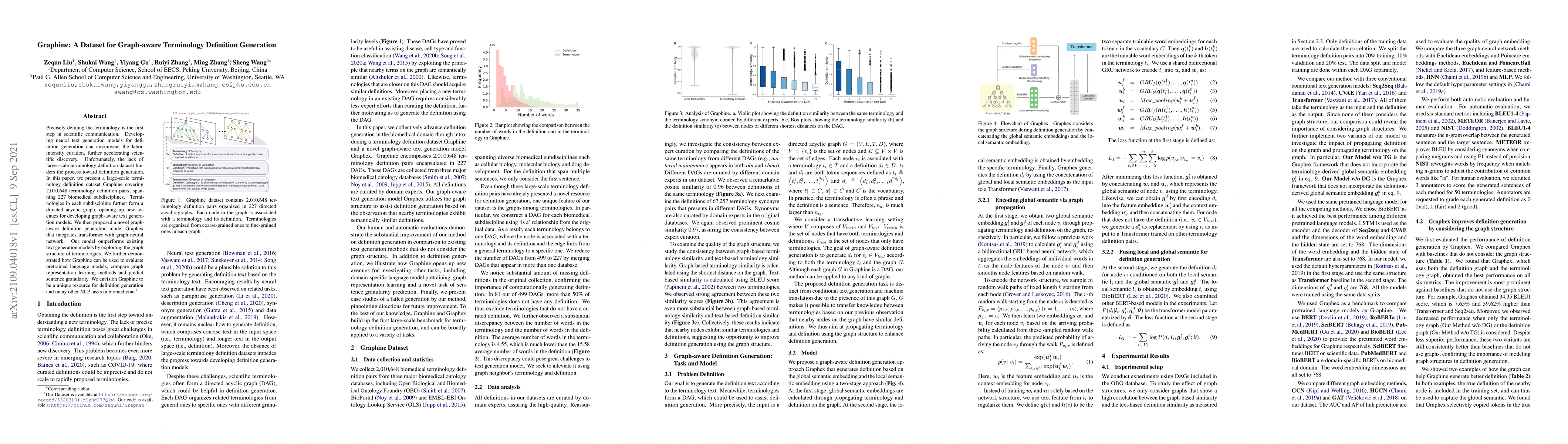 This paper introduces Graphine, a large-scale dataset of 2,010,648 terminology definition pairs across 227 biomedical subdisciplines. It proposes Graphex, a graph-aware definition generation model that integrates transformers with graph neural networks, outperforming existing models by leveraging the graph structure of terminologies.