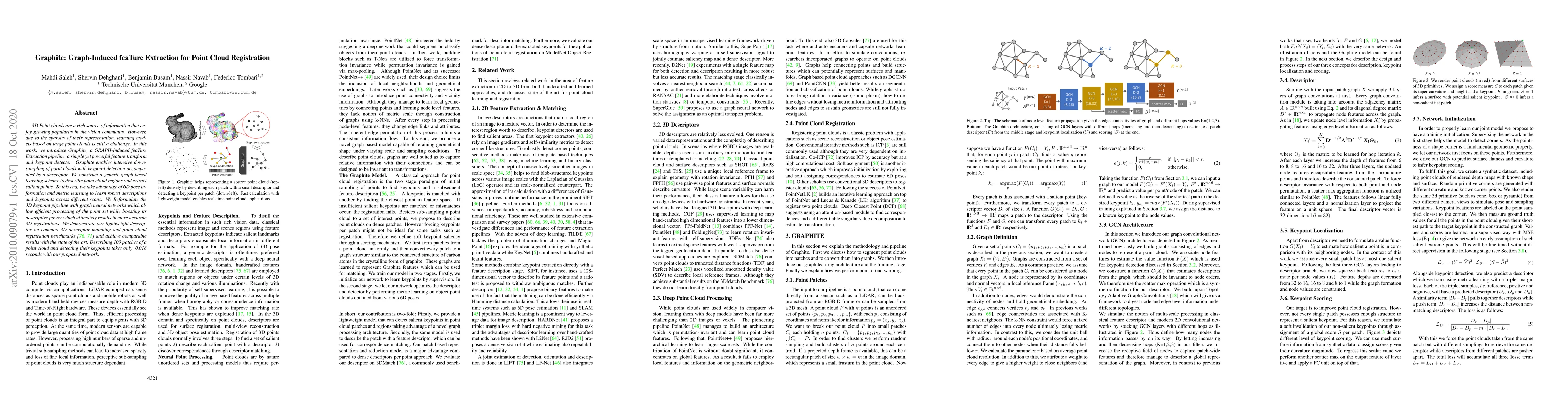 3D Point clouds are a rich source of information that enjoy growing popularity in the vision community. However, due to the sparsity of their representation, learning models based on large point clouds is still a challenge. In this work, we introduce Graphite, a GRAPH-Induced feaTure Extraction pipeline, a simple yet powerful feature transform and keypoint detector. Graphite enables intensive down-sampling of point clouds with keypoint detection accompanied by a descriptor. We construct a generic graph-based learning scheme to describe point cloud regions and extract salient points. To this end, we take advantage of 6D pose information and metric learning to learn robust descriptions and keypoints across different scans. We Reformulate the 3D keypoint pipeline with graph neural networks which allow efficient processing of the point set while boosting its descriptive power which ultimately results in more accurate 3D registrations. We demonstrate our lightweight descriptor on common 3D descriptor matching and point cloud registration benchmarks and achieve comparable results with the state of the art. Describing 100 patches of a point cloud and detecting their keypoints takes only ~0.018 seconds with our proposed network.