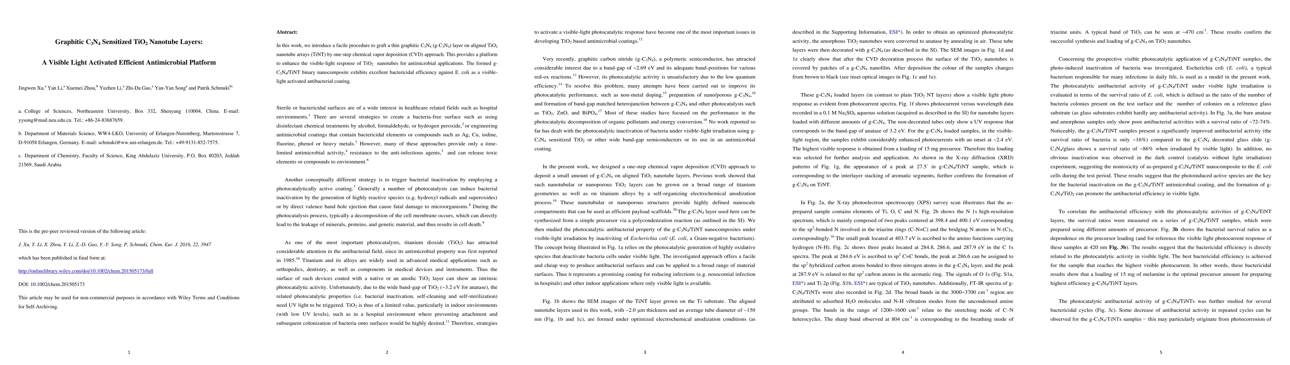 This research presents a method to grow a thin graphitic C3N4 layer on TiO2 nanotubes using a one-step CVD process. The resulting g-C3N4/TiNT nanocomposite shows high efficiency in killing E. coli bacteria under visible light, offering a promising antibacterial coating.