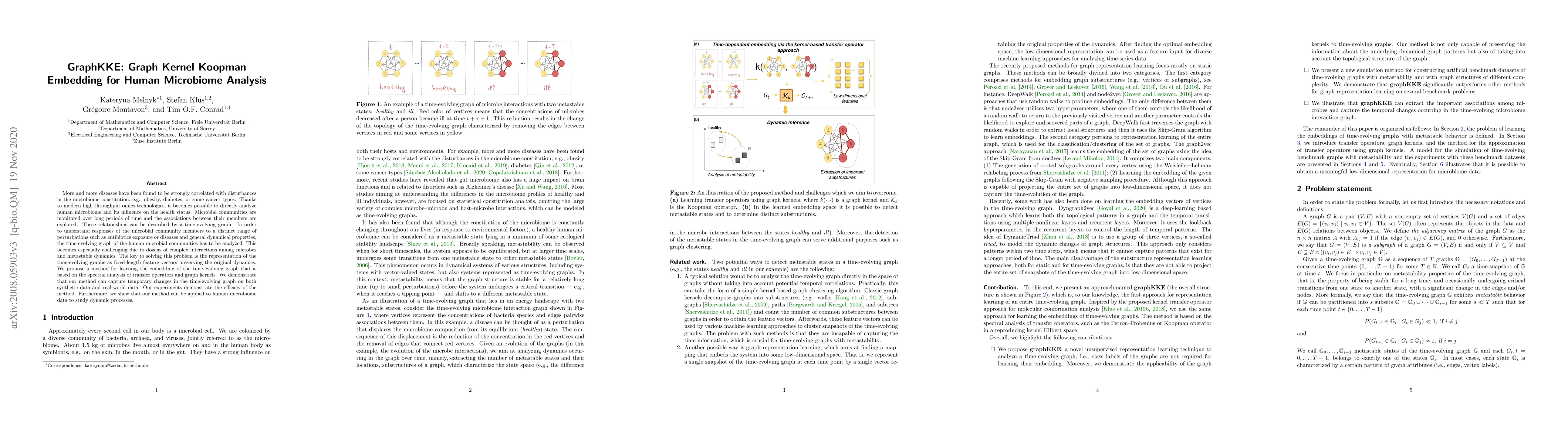 The paper introduces GraphKKE, a method for embedding time-evolving graphs of human microbiomes into fixed-length feature vectors using spectral analysis and graph kernels. The proposed method is shown to effectively capture temporal changes in microbial communities and demonstrate its efficacy on both synthetic and real-world microbiome data.