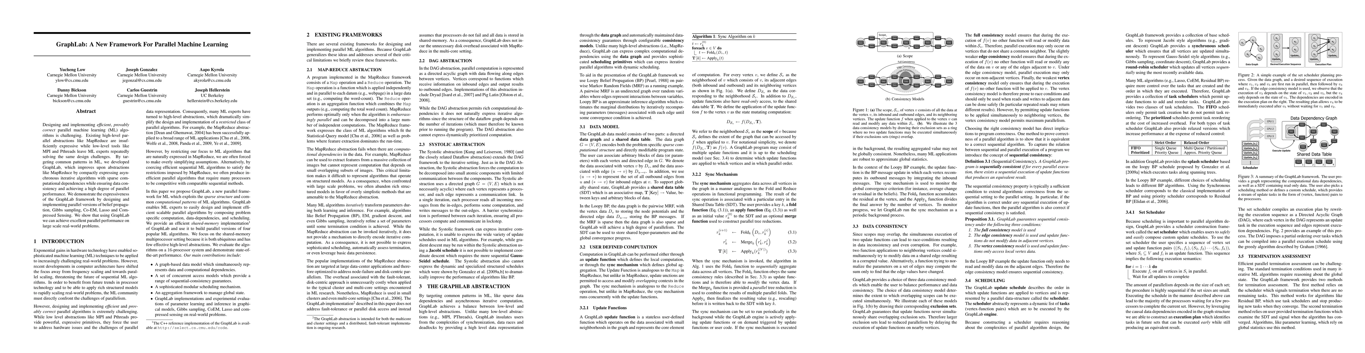 Designing and implementing efficient, provably correct parallel machine learning (ML) algorithms is challenging. Existing high-level parallel abstractions like MapReduce are insufficiently expressive while low-level tools like MPI and Pthreads leave ML experts repeatedly solving the same design challenges. By targeting common patterns in ML, we developed GraphLab, which improves upon abstractions like MapReduce by compactly expressing asynchronous iterative algorithms with sparse computational dependencies while ensuring data consistency and achieving a high degree of parallel performance. We demonstrate the expressiveness of the GraphLab framework by designing and implementing parallel versions of belief propagation, Gibbs sampling, Co-EM, Lasso and Compressed Sensing. We show that using GraphLab we can achieve excellent parallel performance on large scale real-world problems.