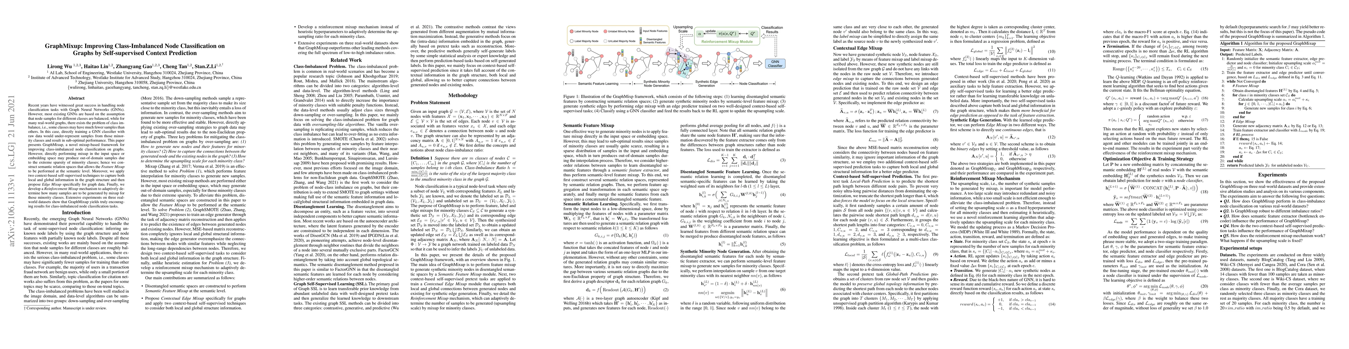 GraphMixup introduces a novel framework leveraging mixup-based techniques to tackle class-imbalanced node classification on graphs. It employs semantic-level feature mixup and context-based self-supervised learning, alongside Edge Mixup and Reinforcement Mixup, to enhance minority class representation, achieving superior performance on real-world datasets.