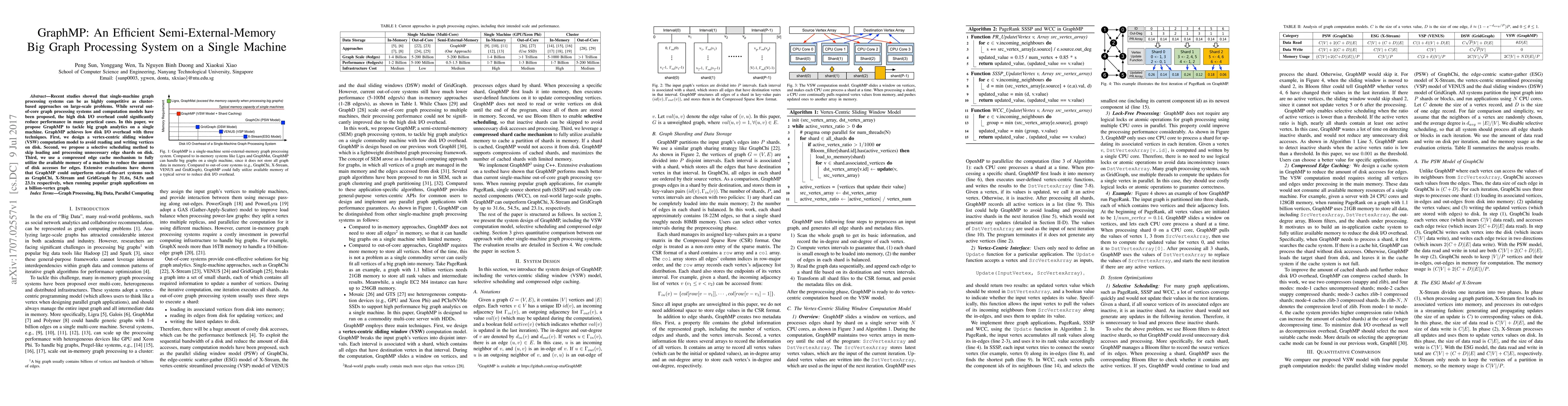 GraphMP is a semi-external-memory big graph processing system designed to efficiently handle large-scale graph analytics on a single machine. It employs a vertex-centric sliding window model, selective scheduling, and a compressed edge cache to minimize disk I/O overhead and outperform existing systems.