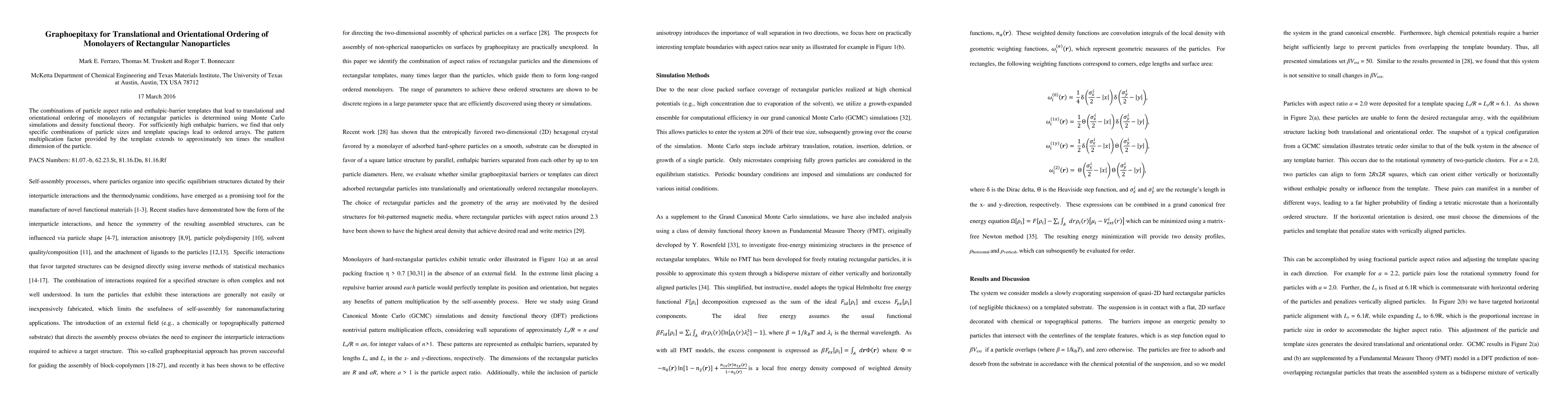 This study uses Monte Carlo simulations and density functional theory to determine the conditions for ordering monolayers of rectangular nanoparticles. It finds that only specific particle sizes and template spacings, with sufficiently high enthalpic barriers, lead to ordered arrays, with the template's pattern multiplication factor reaching up to ten times the smallest particle dimension.