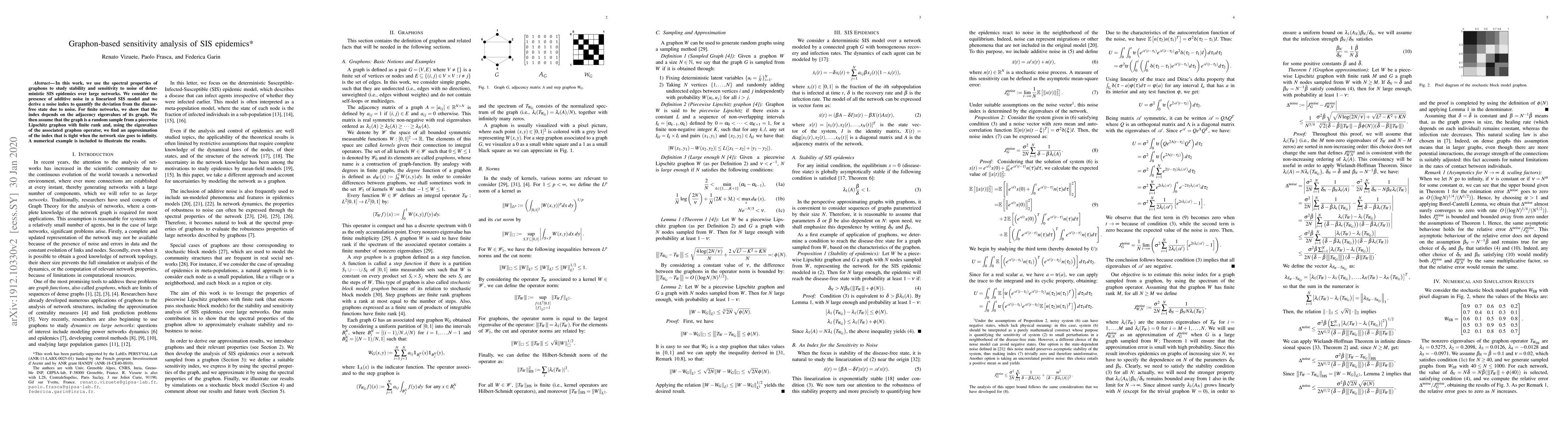 This paper utilizes graphon spectral properties to analyze stability and noise sensitivity in deterministic SIS epidemic models over large networks. It derives a noise index for quantifying deviations from the disease-free state, showing that for finite networks, this index correlates with adjacency eigenvalues, and for infinite networks, it approximates using graphon operator eigenvalues.