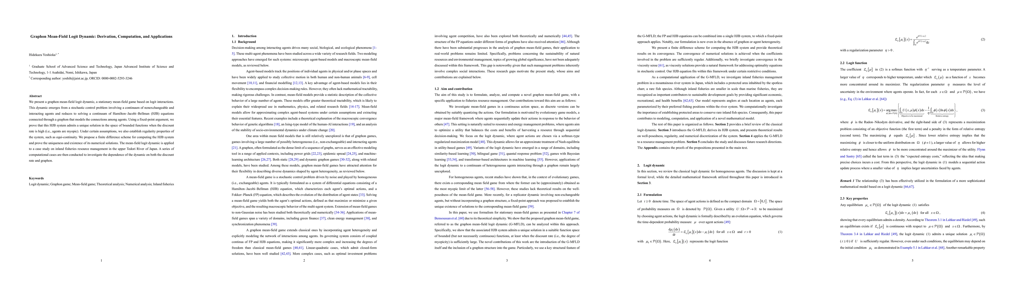 We present a graphon mean-field logit dynamic, a stationary mean-field game based on logit interactions. This dynamic emerges from a stochastic control problem involving a continuum of nonexchangeable and interacting agents and reduces to solving a continuum of Hamilton-Jacobi-Bellman (HJB) equations connected through a graphon that models the connections among agents. Using a fixed-point argument, we prove that this HJB system admits a unique solution in the space of bounded functions when the discount rate is high (i.e., agents are myopic). Under certain assumptions, we also establish regularity properties of the system, such as equi-continuity. We propose a finite difference scheme for computing the HJB system and prove the uniqueness and existence of its numerical solutions. The mean-field logit dynamic is applied to a case study on inland fisheries resource management in the upper Tedori River of Japan. A series of computational cases are then conducted to investigate the dependence of the dynamic on both the discount rate and graphon.