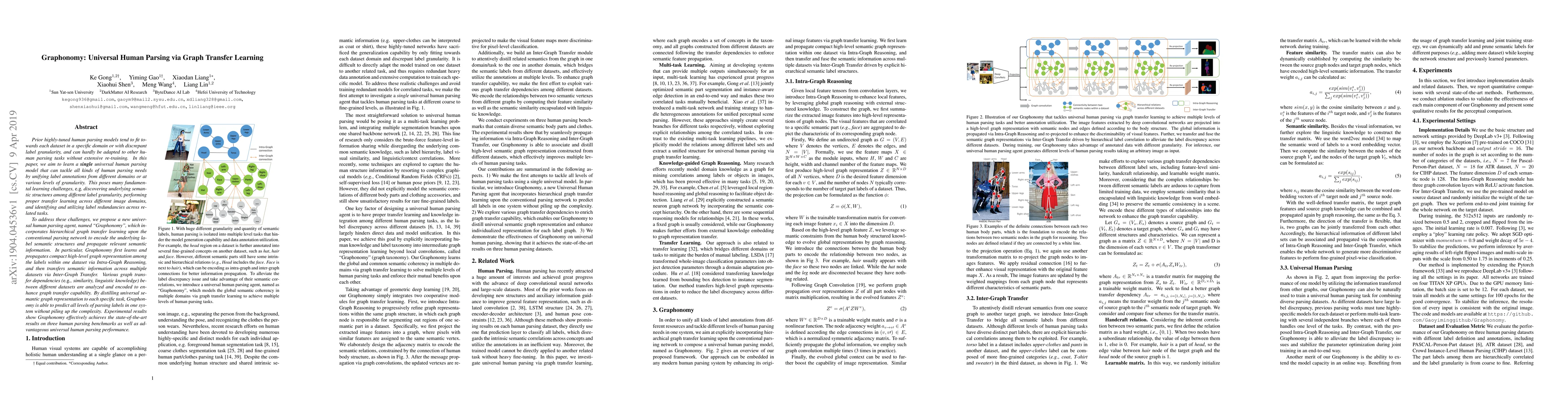 The paper proposes "Graphonomy," a universal human parsing model using hierarchical graph transfer learning to tackle various parsing tasks across different datasets by encoding underlying label semantic structures and leveraging label redundancies. Graphonomy achieves state-of-the-art performance by transferring semantic information across datasets and predicting diverse parsing labels efficiently.