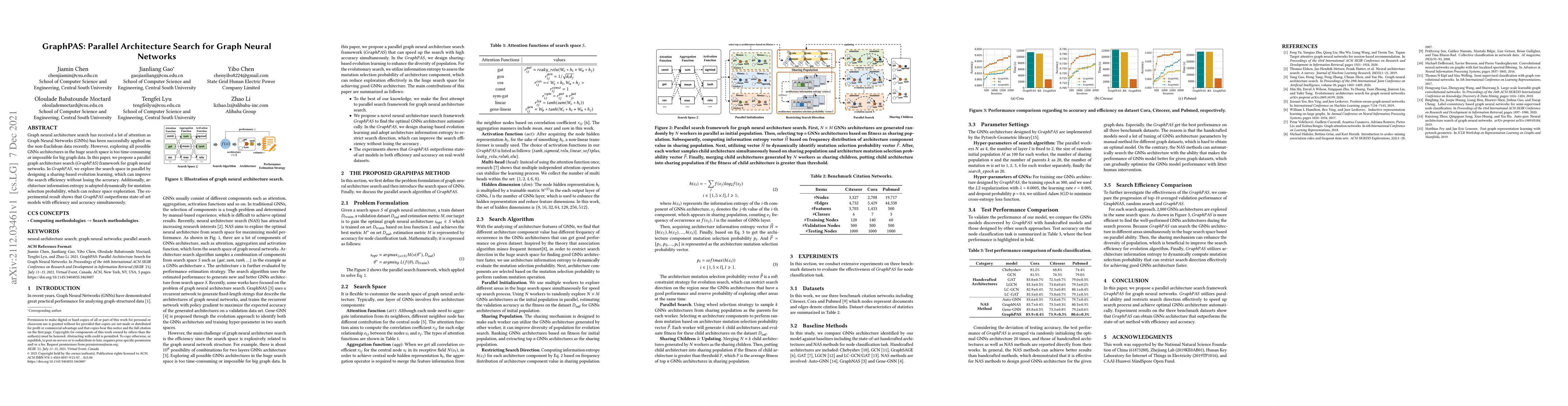 The paper introduces GraphPAS, a parallel architecture search framework for graph neural networks, which employs sharing-based evolution learning to enhance search efficiency while maintaining accuracy. The method dynamically uses architecture information entropy for mutation selection, reducing unnecessary exploration, and outperforms existing models in both efficiency and accuracy.