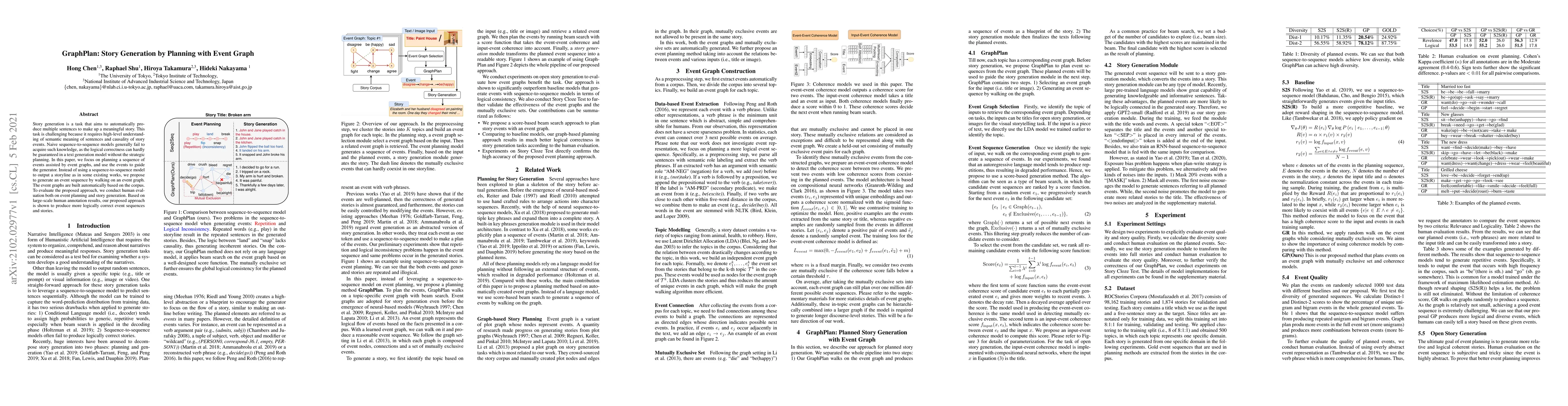 This paper proposes a method for story generation using GraphPlan, which involves planning a sequence of events through event graphs to ensure logical coherence. The approach generates event sequences based on automatically constructed event graphs from a corpus, leading to more logically correct stories compared to sequence-to-sequence models.