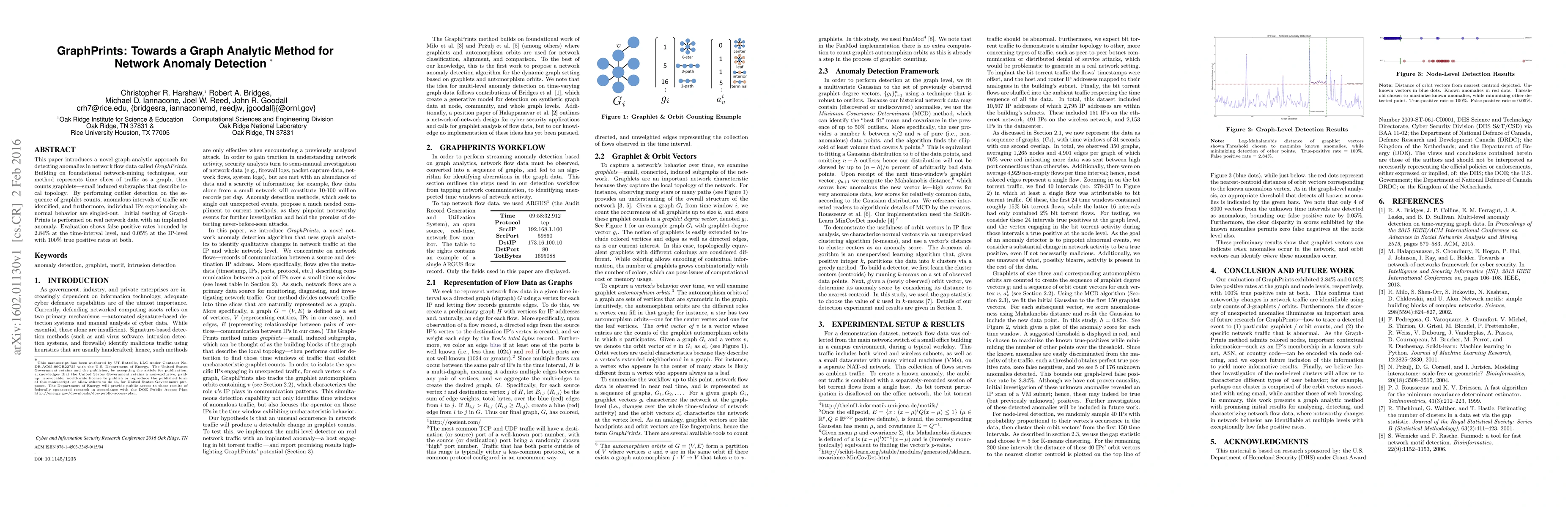 GraphPrints detects network anomalies by representing traffic patterns as a graph and identifying unusual subgraphs, with low false positive rates of 2.84% at the time-interval level and 0.05% at the IP-level.
