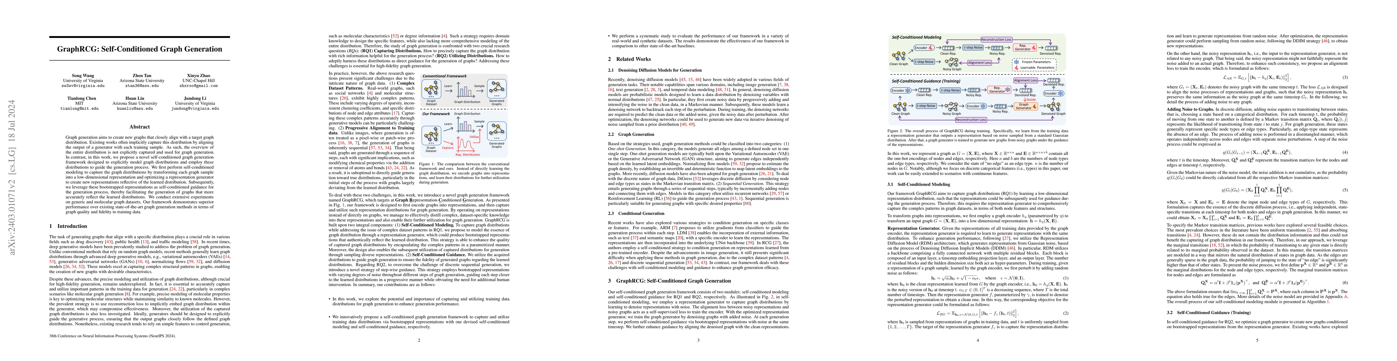 GraphRCG proposes a self-conditioned framework for graph generation that explicitly models graph distributions using bootstrapped representations, leading to superior generation quality and fidelity compared to existing methods. Extensive experiments on diverse datasets show its effectiveness.