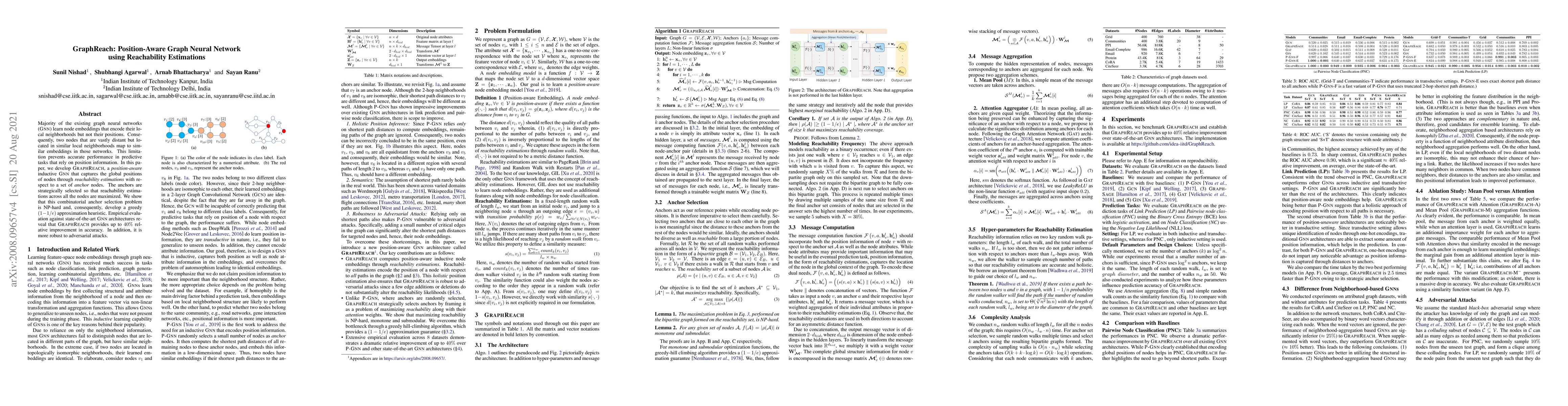 GraphReach is a position-aware graph neural network that uses reachability estimations to capture node positions, addressing the limitation of local neighborhood-based embeddings. It employs a greedy heuristic to select anchor nodes for optimal reachability, achieving up to 40% relative accuracy improvement and enhanced robustness against adversarial attacks.