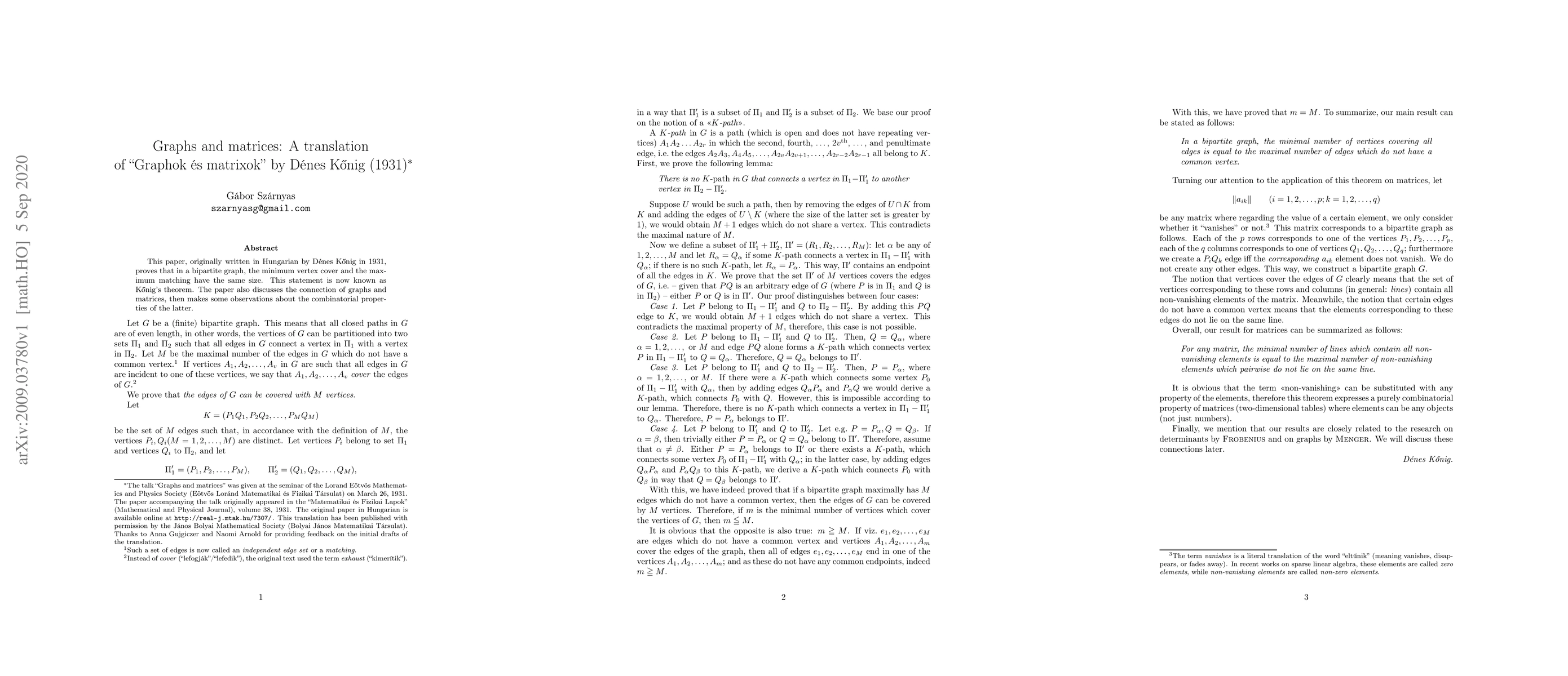 Summary: Dénès Kőnig's 1931 Hungarian paper establishes Kőnig's theorem, showing that in bipartite graphs, the minimum vertex cover equals the maximum matching. It further explores the relationship between graphs and matrices, noting combinatorial properties of the latter.
