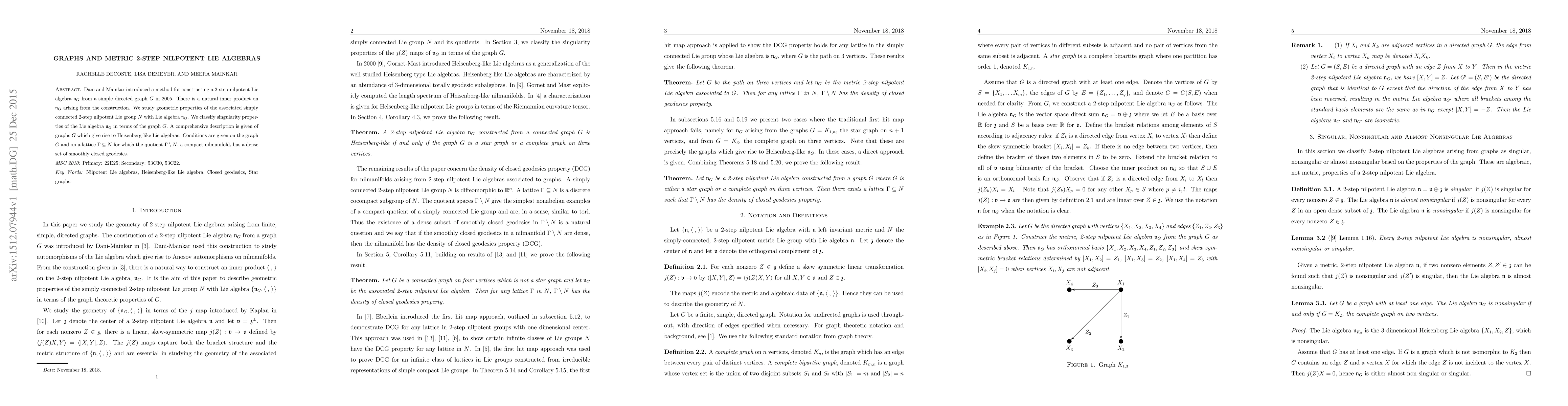 Dani and Mainkar introduced a method for constructing a 2-step nilpotent Lie algebra $\mathfrak{n}_G$ from a simple directed graph $G$ in 2005. There is a natural inner product on $\mathfrak{n}_G$ arising from the construction. We study geometric properties of the associated simply connected 2-step nilpotent Lie group $N$ with Lie algebra $\mathfrak{n}_G$. We classify singularity properties of the Lie algebra $\mathfrak{n}_G$ in terms of the graph $G$. A comprehensive description is given of graphs $G$ which give rise to Heisenberg-like Lie algebras. Conditions are given on the graph $G$ and on a lattice $\Gamma \subseteq N$ for which the quotient $\Gamma \backslash N$, a compact nilmanifold, has a dense set of smoothly closed geodesics.