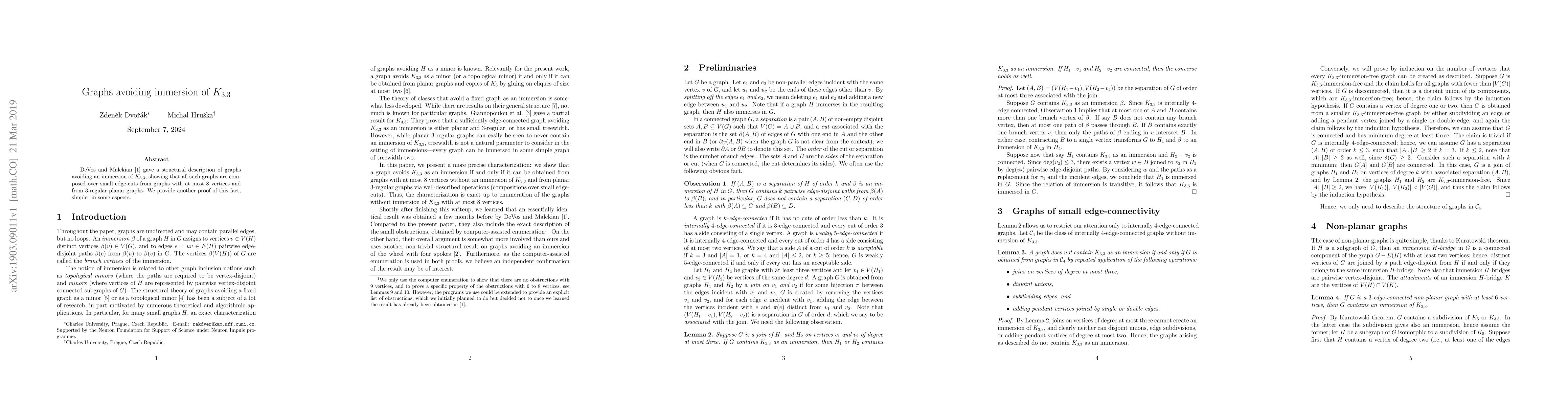 Title: Graphs avoiding immersion of K_{3,3} Summary: This paper offers a simpler alternative proof that graphs avoiding the immersion of K_{3,3} are constructed from small edge-cuts of graphs with at most 8 vertices and 3-regular planar graphs, as originally described by DeVos and Malekian.
