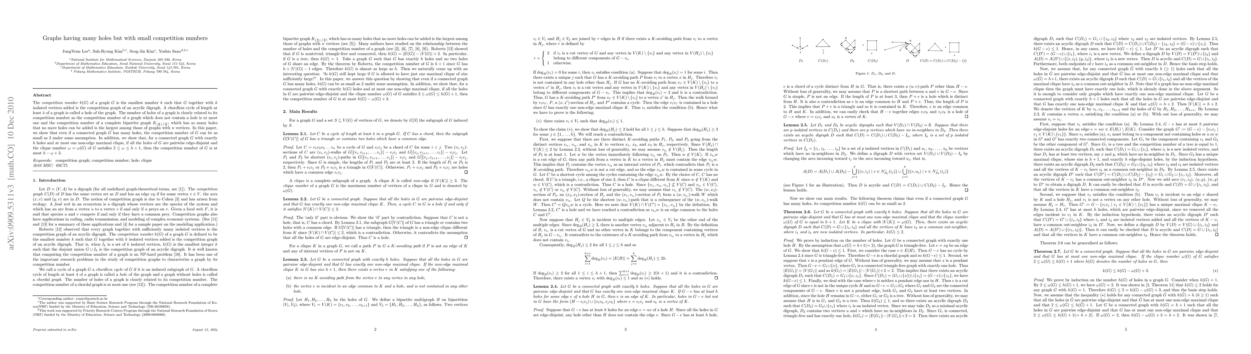 The competition number k(G) of a graph G is the smallest number k such that G together with k isolated vertices added is the competition graph of an acyclic digraph. A chordless cycle of length at least 4 of a graph is called a hole of the graph. The number of holes of a graph is closely related to its competition number as the competition number of a graph which does not contain a hole is at most one and the competition number of a complete bipartite graph $K_{\lfloor \frac{n}{2} \rfloor, \lceil \frac{n}{2} \rceil}$ which has so many holes that no more holes can be added is the largest among those of graphs with n vertices. In this paper, we show that even if a connected graph G has many holes, the competition number of G can be as small as 2 under some assumption. In addition, we show that, for a connected graph G with exactly h holes and at most one non-edge maximal clique, if all the holes of G are pairwise edge-disjoint and the clique number $\omega = \omega (G)$ of G satisfies $2 \leq \omega \leq h+1$, then the competition number of G is at most $h - \omega + 3$.