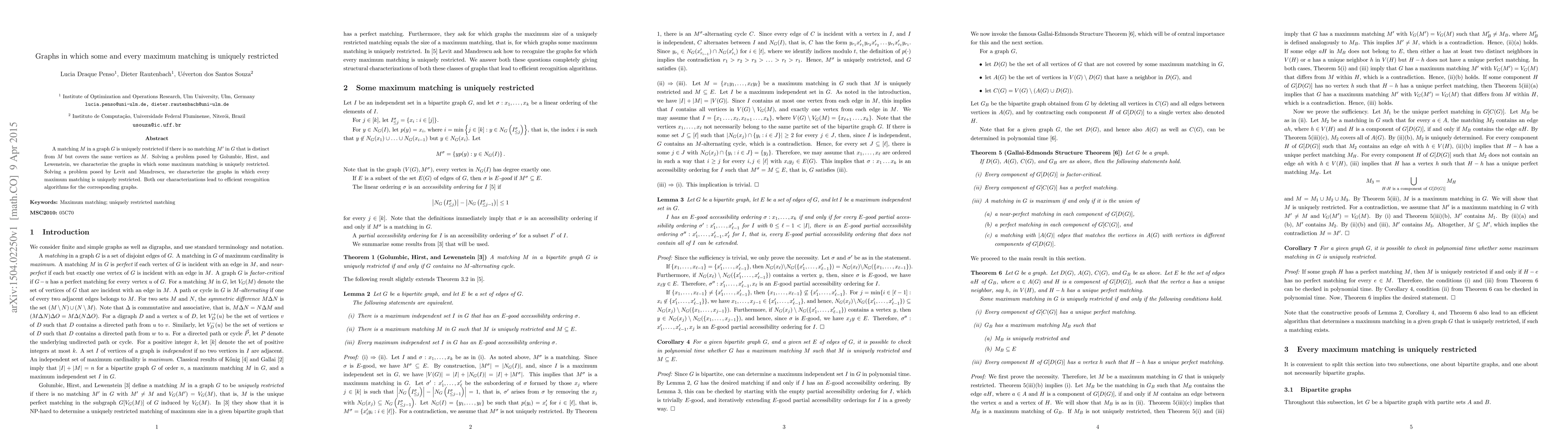 This paper characterizes graphs where some or all maximum matchings are uniquely restricted, solving problems posed by several researchers. It also provides efficient recognition algorithms for these graph types.