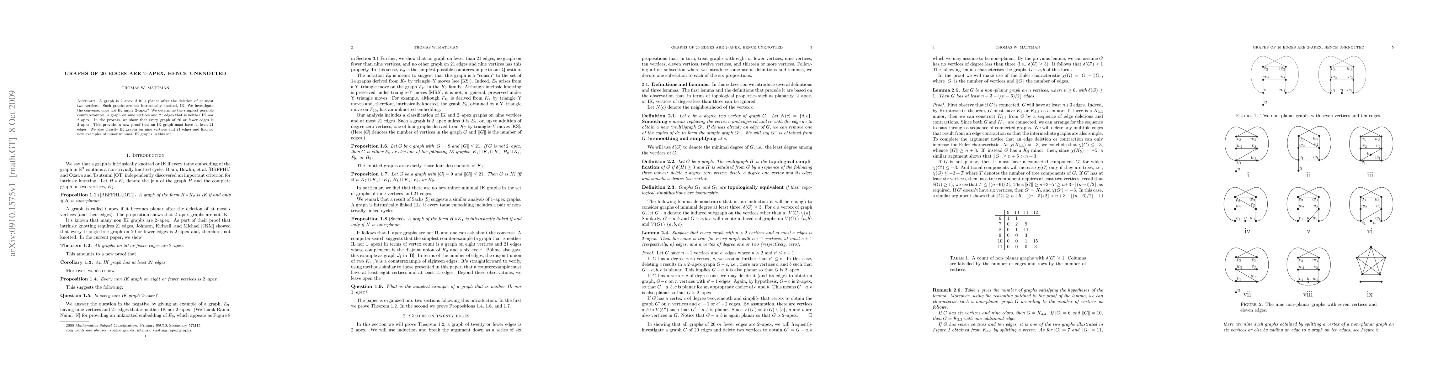 A new proof shows that graphs with 20 edges or fewer are 2-apex, implying they cannot be intrinsically knotted, and provides a counterexample for the converse implication, which is a graph on nine vertices with 21 edges that is neither IK nor 2-apex.