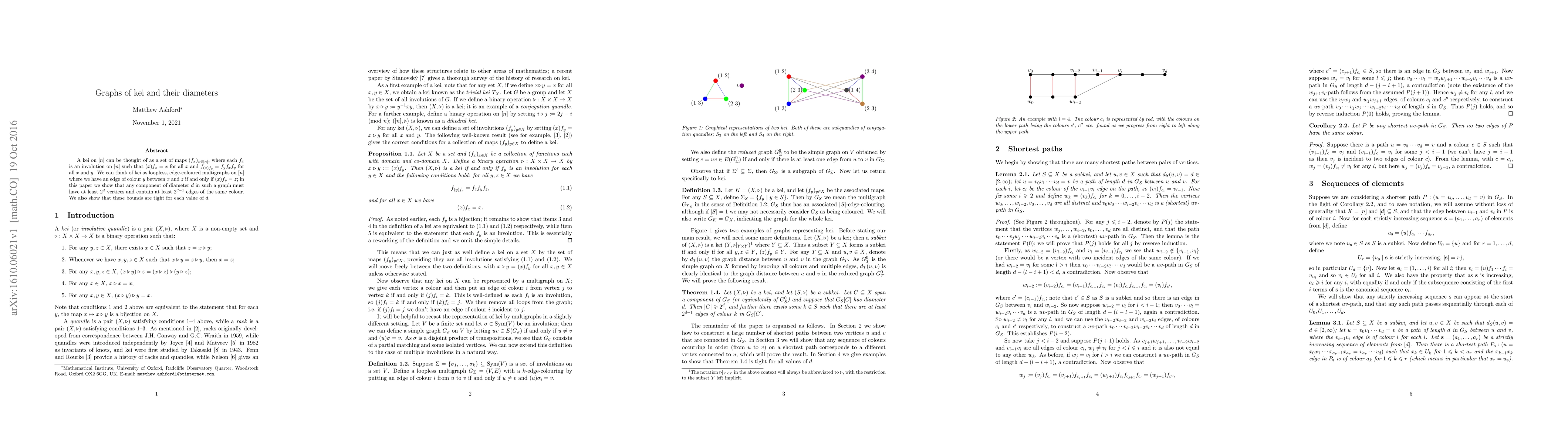 This paper investigates the properties of kei graphs, which are loopless, edge-coloured multigraphs defined by involutions. It proves that any component with diameter $d$ must contain at least $2^d$ vertices and $2^{d-1}$ edges of the same colour, with these bounds shown to be tight.