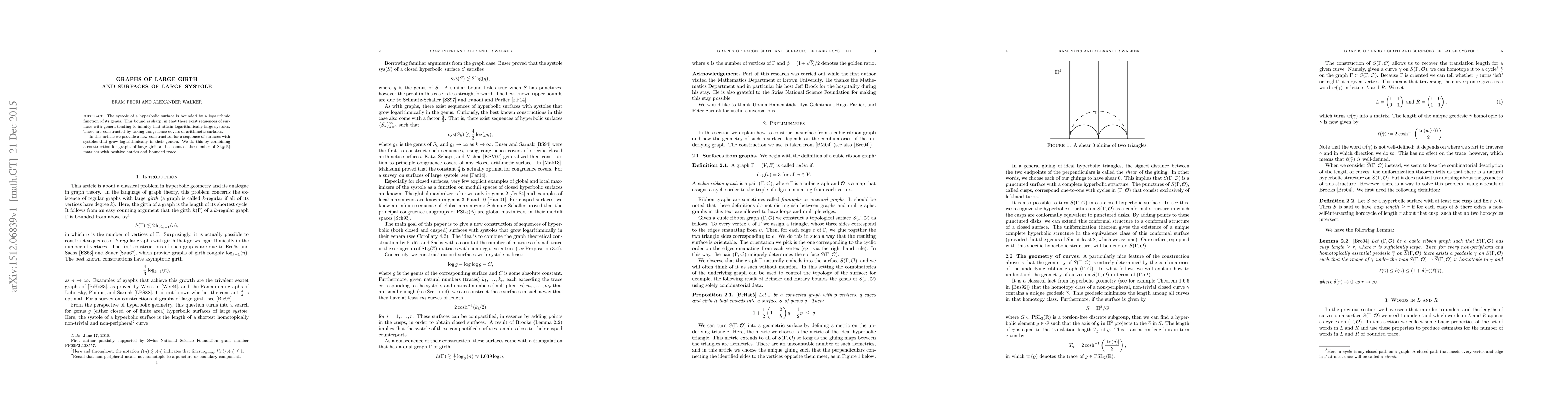 The systole of a hyperbolic surface is bounded by a logarithmic function of its genus. This bound is sharp, in that there exist sequences of surfaces with genera tending to infinity that attain logarithmically large systoles. These are constructed by taking congruence covers of arithmetic surfaces. In this article we provide a new construction for a sequence of surfaces with systoles that grow logarithmically in their genera. We do this by combining a construction for graphs of large girth and a count of the number of $\mathrm{SL}_2(\mathbb{Z})$ matrices with positive entries and bounded trace.