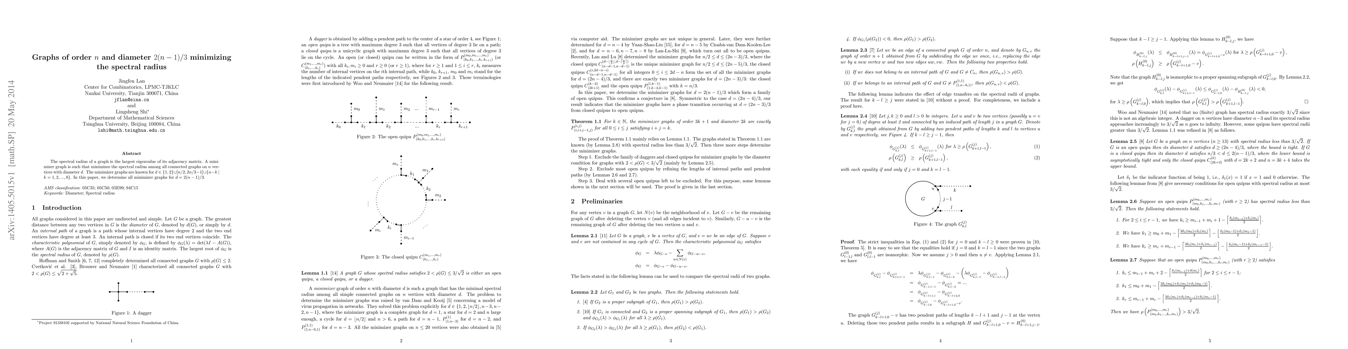 The spectral radius of a graph is the largest eigenvalue of its adjacency matrix. A minimizer graph is such that minimizes the spectral radius among all connected graphs on $n$ vertices with diameter $d$. The minimizer graphs are known for $d\in\{1,2\}\cup [n/2,2n/3-1]\cup\{n-k\mid k=1,2,...,8\}$. In this paper, we determine all minimizer graphs for $d=2(n-1)/3$.