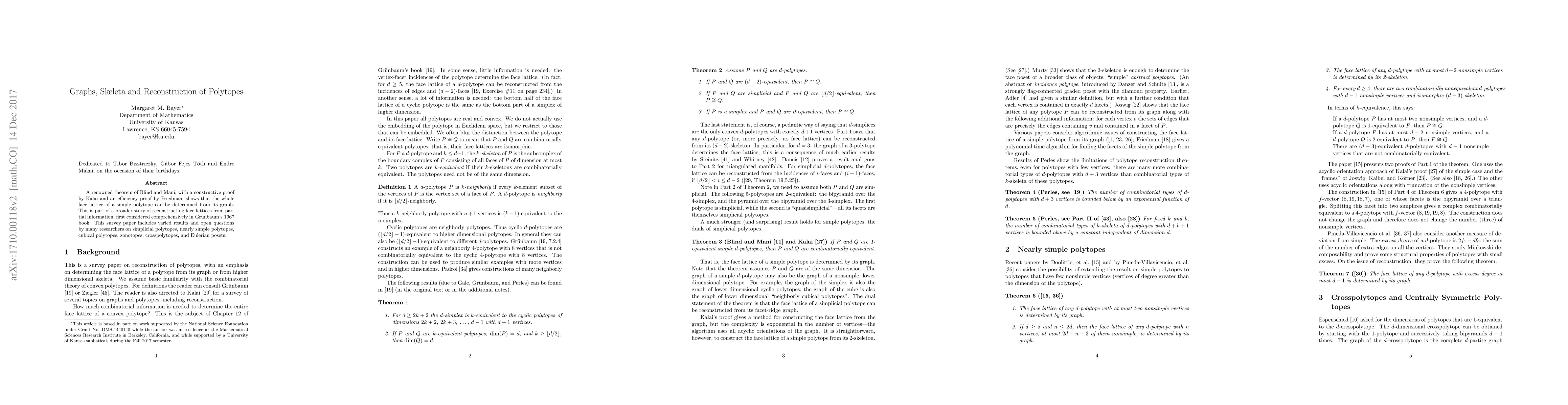 A renowned theorem of Blind and Mani, with a constructive proof by Kalai and an efficiency proof by Friedman, shows that the whole face lattice of a simple polytope can be determined from its graph. This is part of a broader story of reconstructing face lattices from partial information, first considered comprehensively in Gr\"unbaum's 1967 book. This survey paper includes varied results and open questions by many researchers on simplicial polytopes, nearly simple polytopes, cubical polytopes, zonotopes, crosspolytopes, and Eulerian posets.
