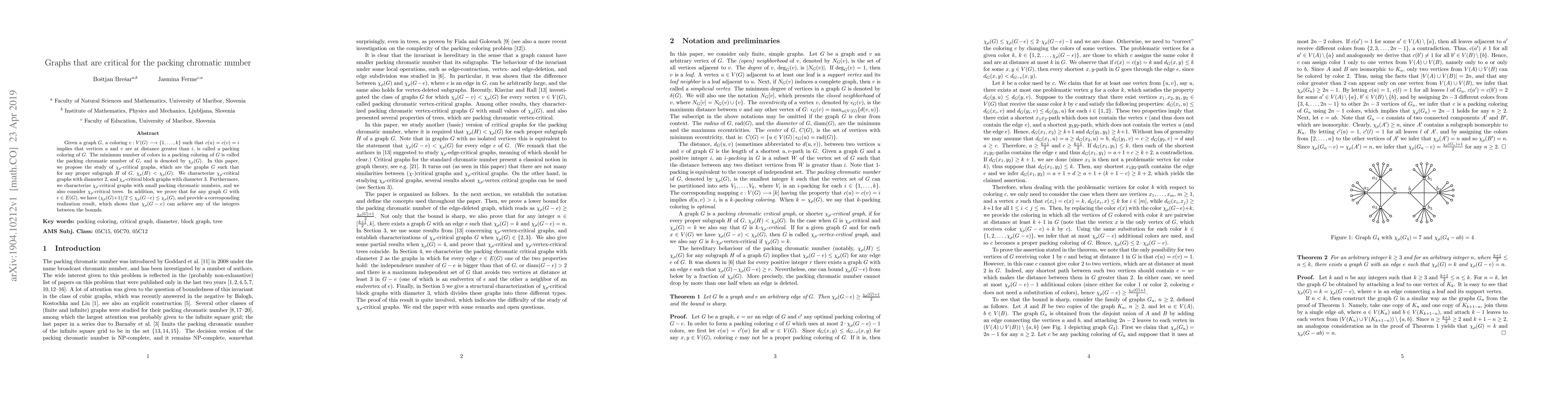 This paper studies $\chi_\rho$-critical graphs, which require the maximum packing chromatic number for any proper subgraph. It characterizes $\chi_\rho$-critical graphs with diameter 2 and block graphs with diameter 3, and explores $\chi_\rho$-critical trees and those with small packing chromatic numbers. Additionally, it establishes bounds for the packing chromatic number when an edge is removed from any graph.