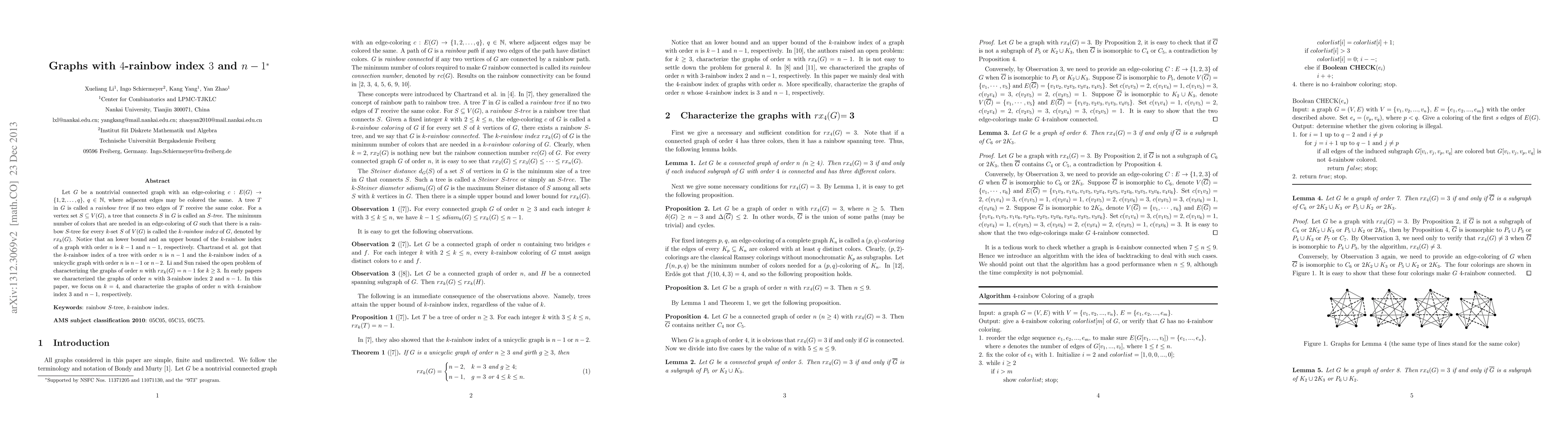 Let $G$ be a nontrivial connected graph with an edge-coloring $c:E(G)\rightarrow \{1,2,\ldots,q\},$ $q\in \mathbb{N}$, where adjacent edges may be colored the same. A tree $T$ in $G$ is called a $rainbow~tree$ if no two edges of $T$ receive the same color. For a vertex set $S\subseteq V(G)$, a tree that connects $S$ in $G$ is called an {\it $S$-tree}. The minimum number of colors that are needed in an edge-coloring of $G$ such that there is a rainbow $S$-tree for every $k$-set $S$ of $V(G)$ is called the {\it $k$-rainbow index} of $G$, denoted by $rx_k(G)$. Notice that an lower bound and an upper bound of the $k$-rainbow index of a graph with order $n$ is $k-1$ and $n-1$, respectively. Chartrand et al. got that the $k$-rainbow index of a tree with order $n$ is $n-1$ and the $k$-rainbow index of a unicyclic graph with order $n$ is $n-1$ or $n-2$. Li and Sun raised the open problem of characterizing the graphs of order $n$ with $rx_k(G)=n-1$ for $k\geq 3$. In early papers we characterized the graphs of order $n$ with 3-rainbow index 2 and $n-1$. In this paper, we focus on $k=4$, and characterize the graphs of order $n$ with 4-rainbow index 3 and $n-1$, respectively.