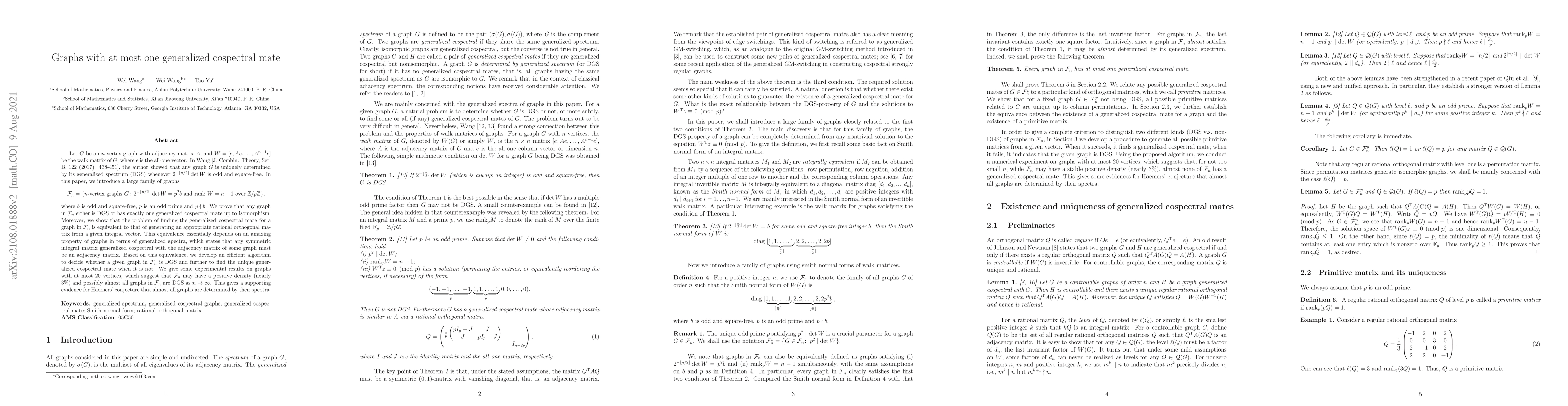 Let $G$ be an $n$-vertex graph with adjacency matrix $A$, and $W=[e,Ae,\ldots,A^{n-1}e]$ be the walk matrix of $G$, where $e$ is the all-one vector. In Wang [J. Combin. Theory, Ser. B, 122 (2017): 438-451], the author showed that any graph $G$ is uniquely determined by its generalized spectrum (DGS) whenever $2^{-\lfloor n/2 \rfloor}\det W$ is odd and square-free. In this paper, we introduce a large family of graphs $\mathcal{F}_n=\{$ $n$-vertex graphs $G\colon\, 2^{-\lfloor n/2 \rfloor}\det W =p^2b$ and rank$W=n-1$ over $\mathbb{Z}/p\mathbb{Z}\},$ where $b$ is odd and square-free, $p$ is an odd prime and $p\nmid b$. We prove that any graph in $\mathcal{F}_n$ either is DGS or has exactly one generalized cospectral mate up to isomorphism. Moreover, we show that the problem of finding the generalized cospectral mate for a graph in $\mathcal{F}_n$ is equivalent to that of generating an appropriate rational orthogonal matrix from a given integral vector. This equivalence essentially depends on an amazing property of graphs in terms of generalized spectra, which states that any symmetric integral matrix generalized cospectral with the adjacency matrix of some graph must be an adjacency matrix. Based on this equivalence, we develop an efficient algorithm to decide whether a given graph in $\mathcal{F}_n$ is DGS and further to find the unique generalized cospectral mate when it is not. We give some experimental results on graphs with at most 20 vertices, which suggest that $\mathcal{F}_n$ may have a positive density (nearly $3\%$) and possibly almost all graphs in $\mathcal{F}_n$ are DGS as $n\rightarrow \infty$. This gives a supporting evidence for Haemers' conjecture that almost all graphs are determined by their spectra.